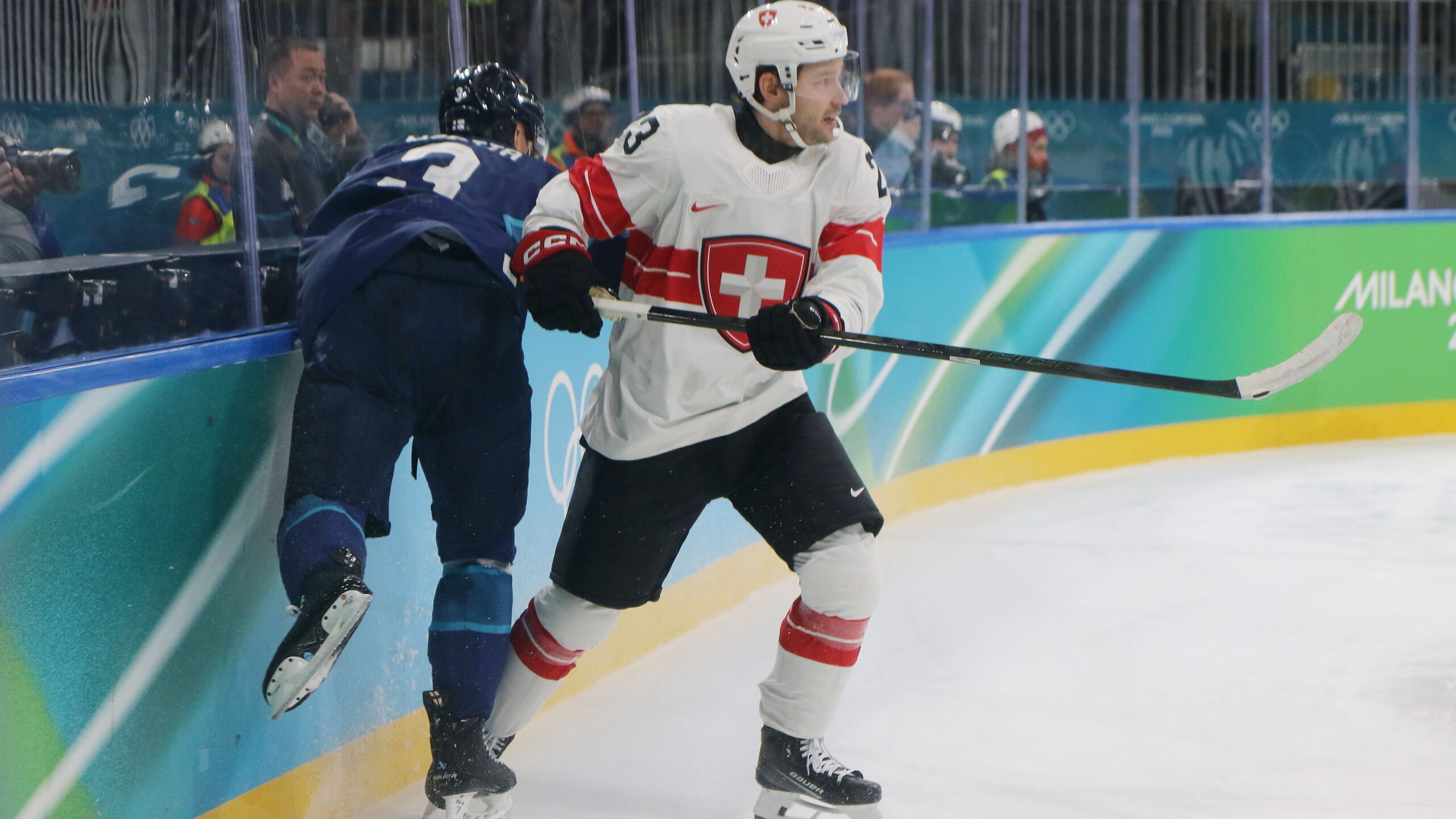 a6T4A2047 18. Februar 2026 2560 × 1440 a6T4A2047 Olli Määttä #3, Philipp Kurashev #23, Olympic Games 2026 Mens QF FIN – SUI, Milano Rho Ice Park, © Puckfans.at / Andreas Robanser