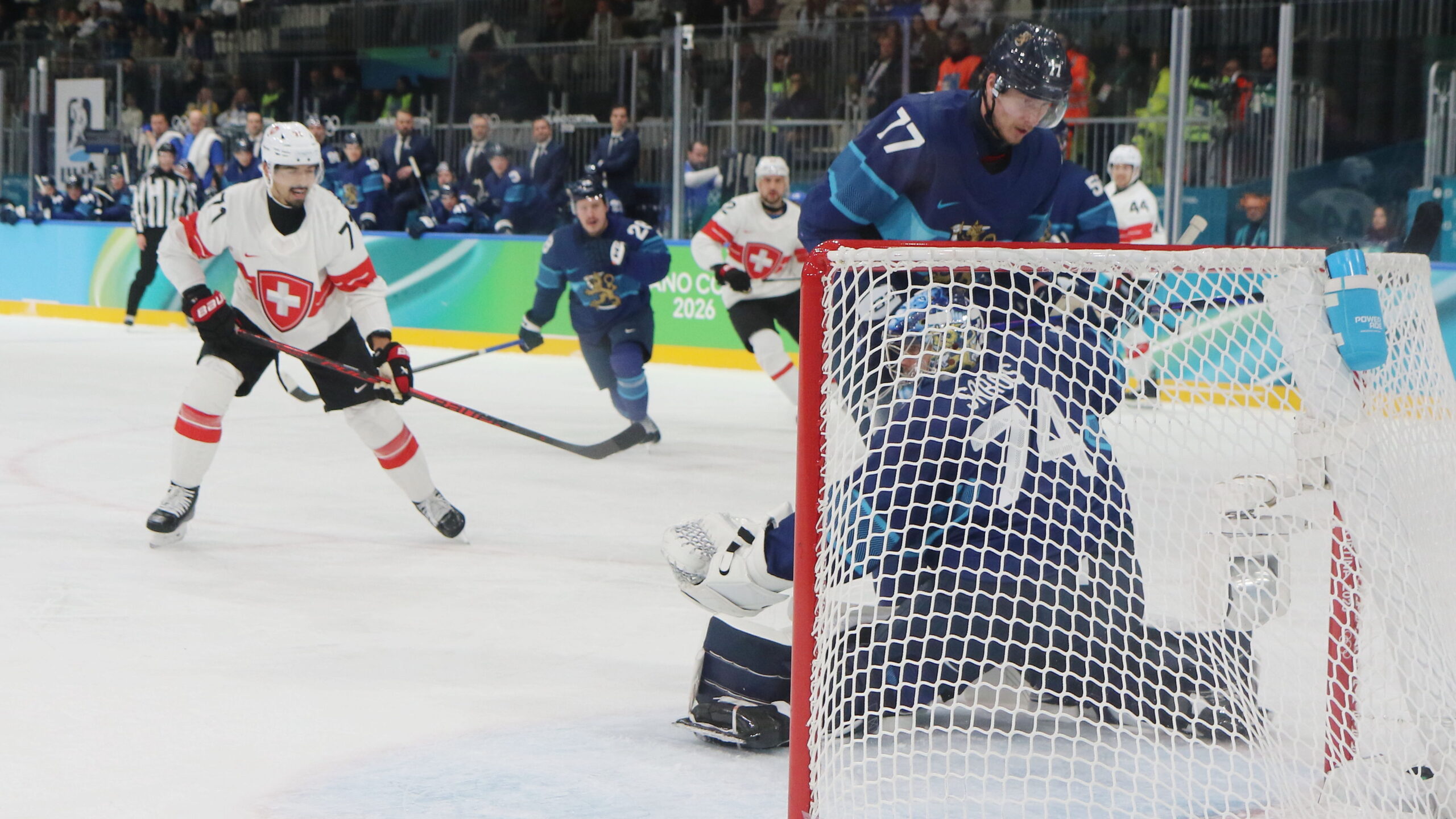 a6T4A2142 18. Februar 2026 2560 × 1440 a6T4A2142 Jonas Siegenthaler #71, Juuse Saros #74, Juuse Saros #74, Olympic Games 2026 Mens QF FIN – SUI, Milano Rho Ice Park, © Puckfans.at / Andreas Robanser