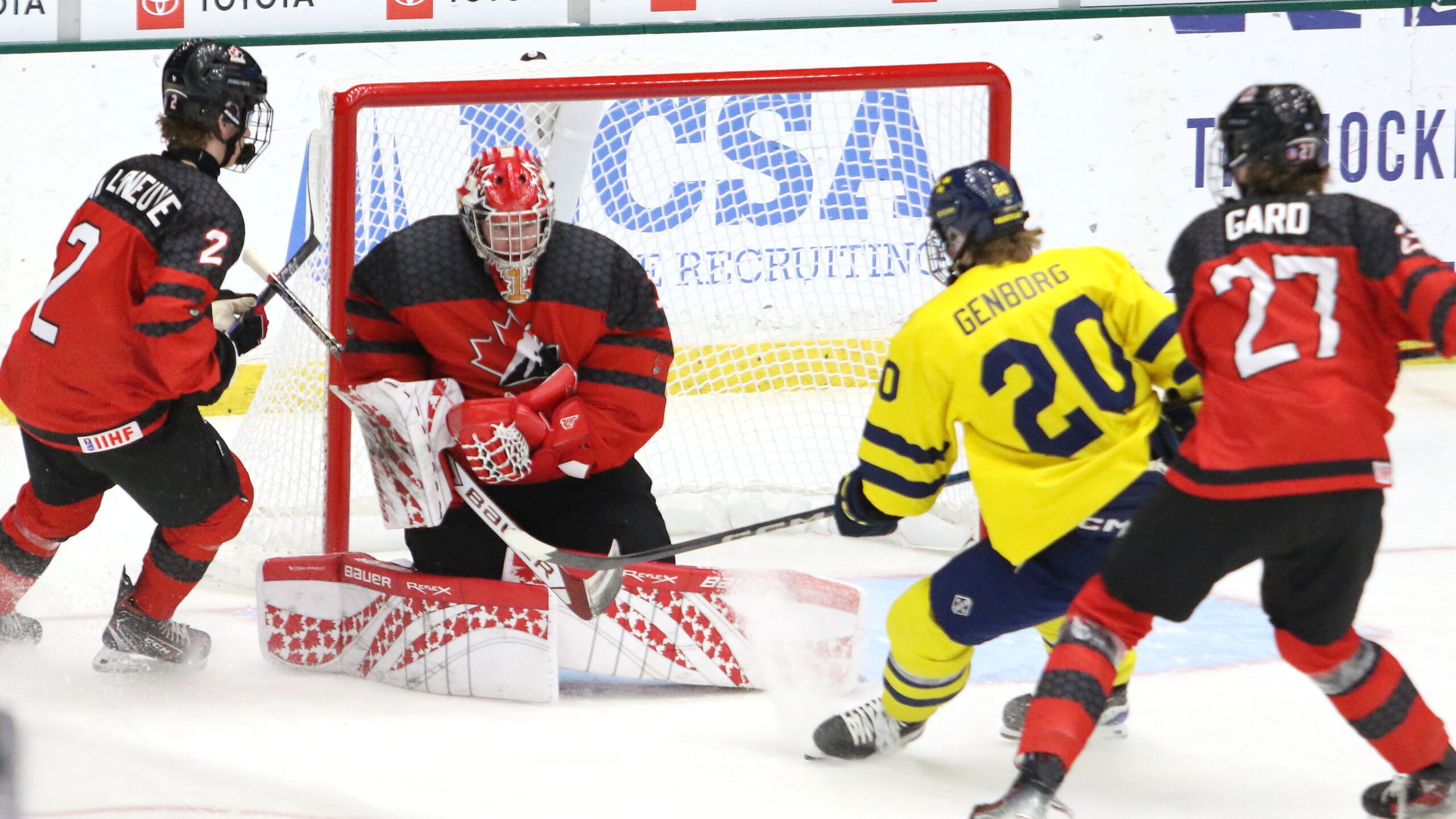 a6T4A2182 4. Mai 2025 2560 × 1440 a6T4A2182 Xavier Villeneuve #2, Jack Ivankovic #1, Eddie Genborg #20, Matthew Gard #27, Final Game CAN – SWE, IIHF U18 Worlds 2025, Comerica Center, Frisco © Puckfans.at / Andreas Robanser