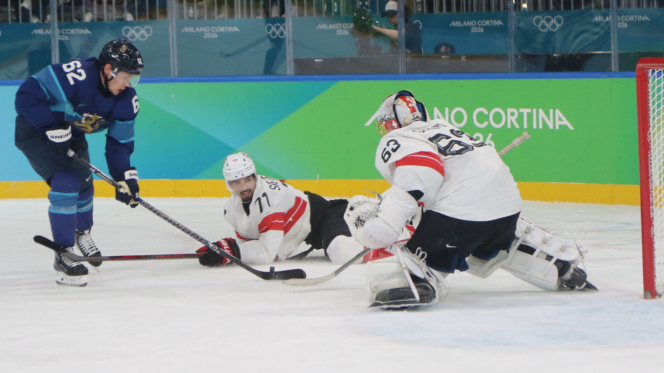 Artturi Lehkonen #62, Jonas Siegenthaler #71, Leonardo Genoni #63, Olympic Games 2026 Mens QF FIN – SUI, Milano Rho Ice Park, © Puckfans.at / Andreas Robanser