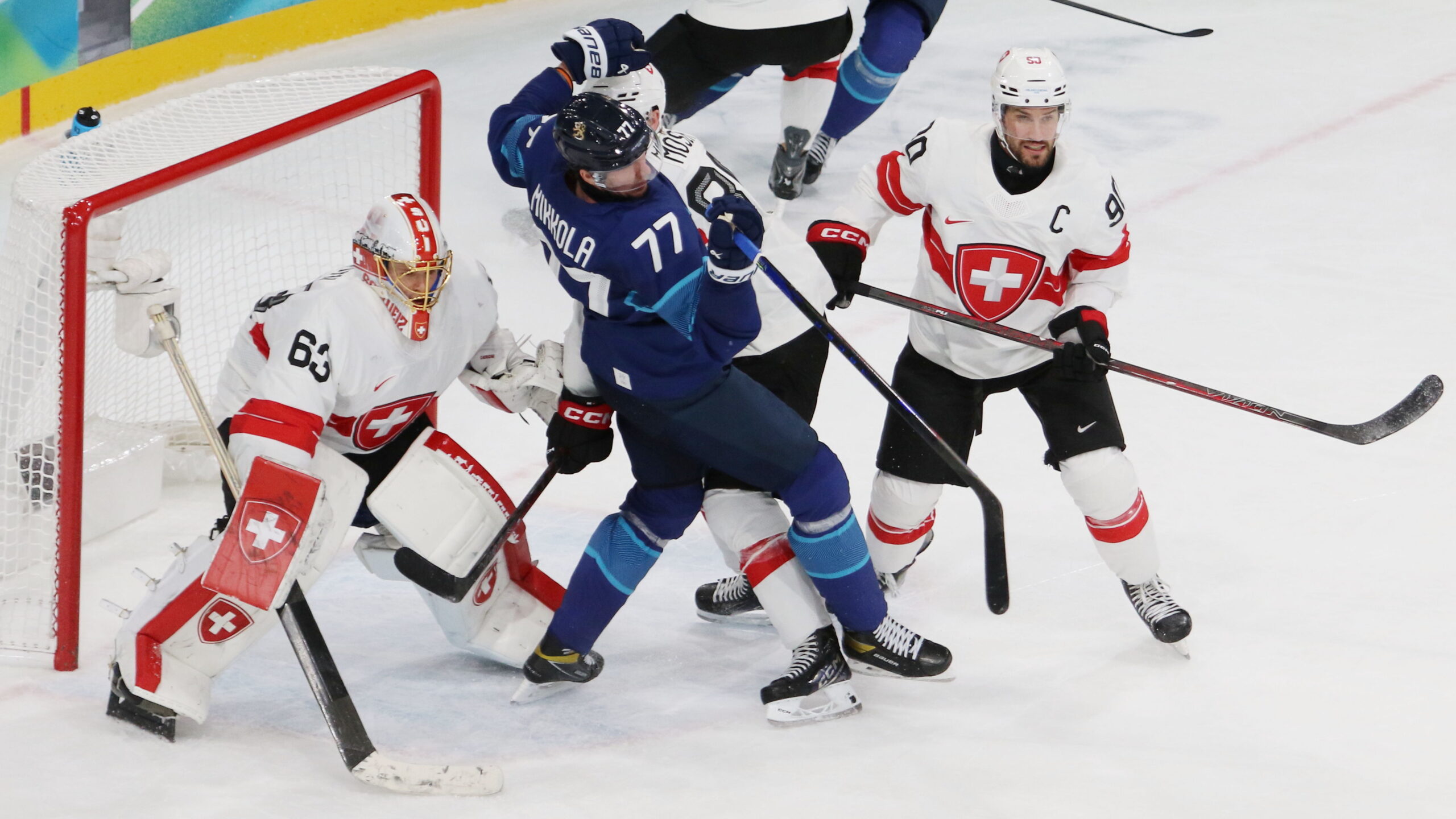Leonardo Genoni #63, Niko Mikkola #77, Roman Josi #90, Olympic Games 2026 Mens QF FIN – SUI, Milano Rho Ice Park, © Puckfans.at / Andreas Robanser
