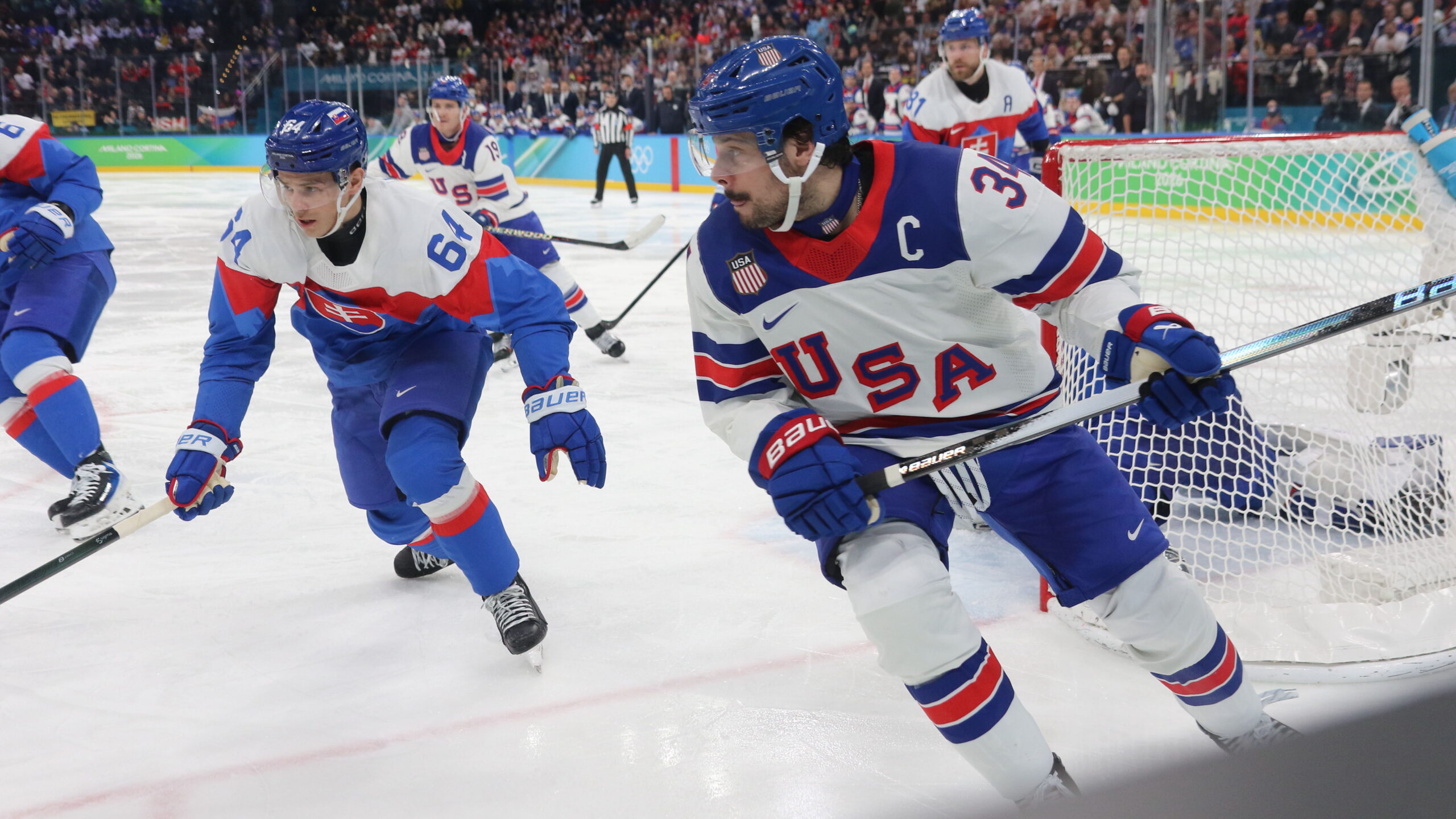Patrik Koch #64, Auston Matthews #34, Olympic Games 2026 Mens Semifinal USA – SVK , Milano Santa Giulia Arena, © Puckfans.at / Andreas Robanser