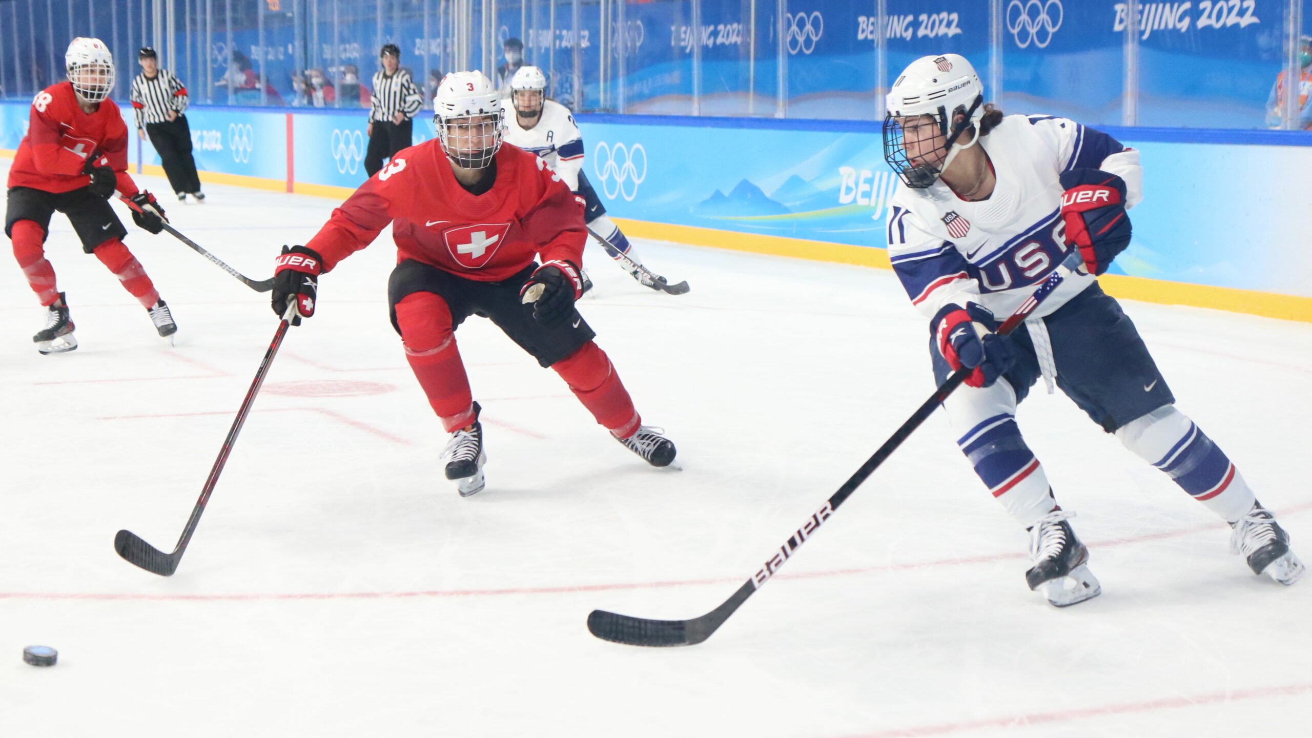 a6T4A4446 6. Februar 2022 2560 × 1440 a6T4A4446 Olympic Games 2022, Hockey Tournament Women Group A SUI – USA Sarah Forster #3, Abby Roque #11 Wukesong Sports Centr, Beijing © Andreas Robanser