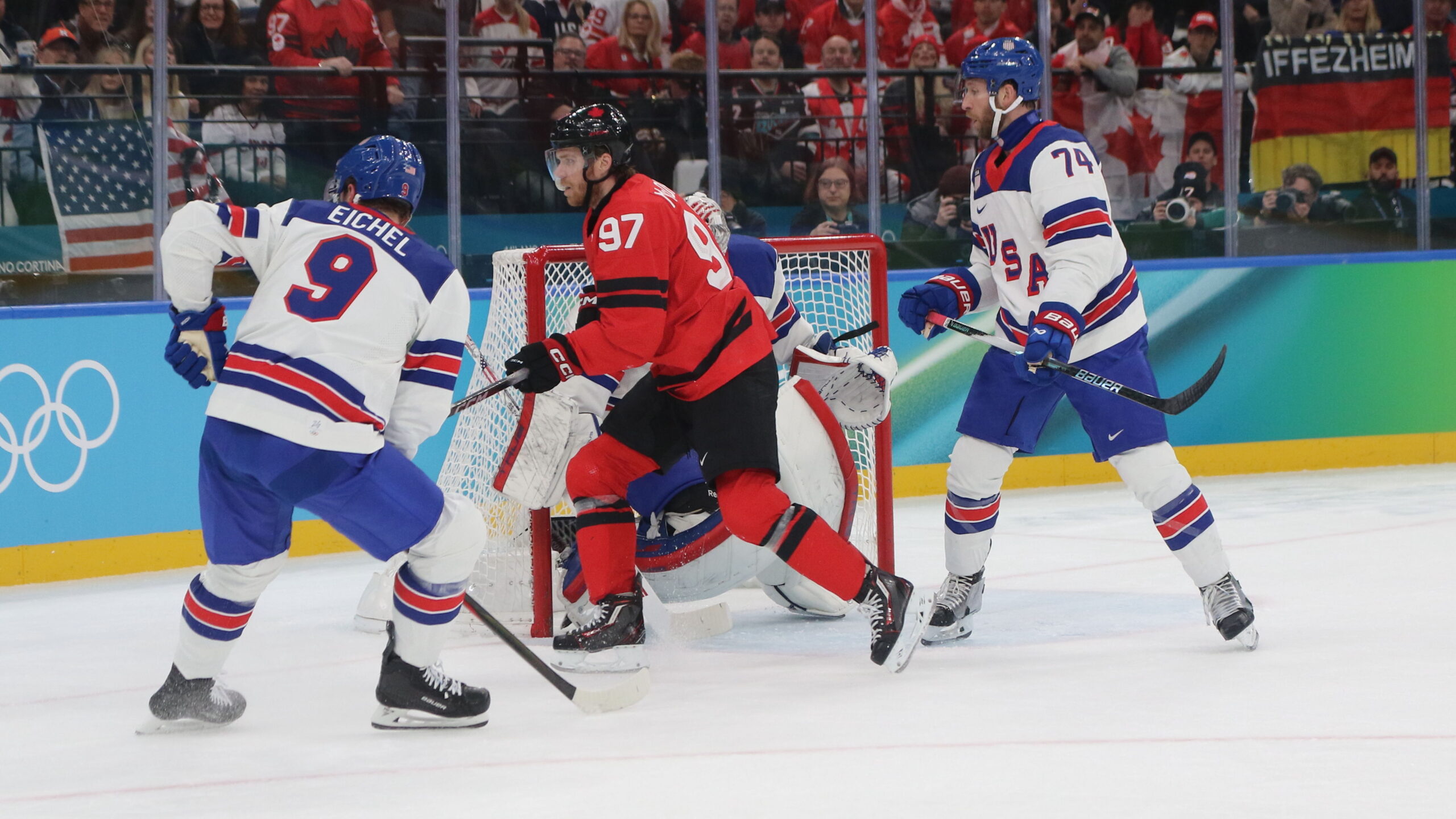 Jack Eichel #9, Connor McDavid #97, Jaccob Slavin #74, Olympic Games 2026 Mens Gold Medal Game CAN – USA, Milano Santa Giulia Arena, © Puckfans.at / Andreas Robanser