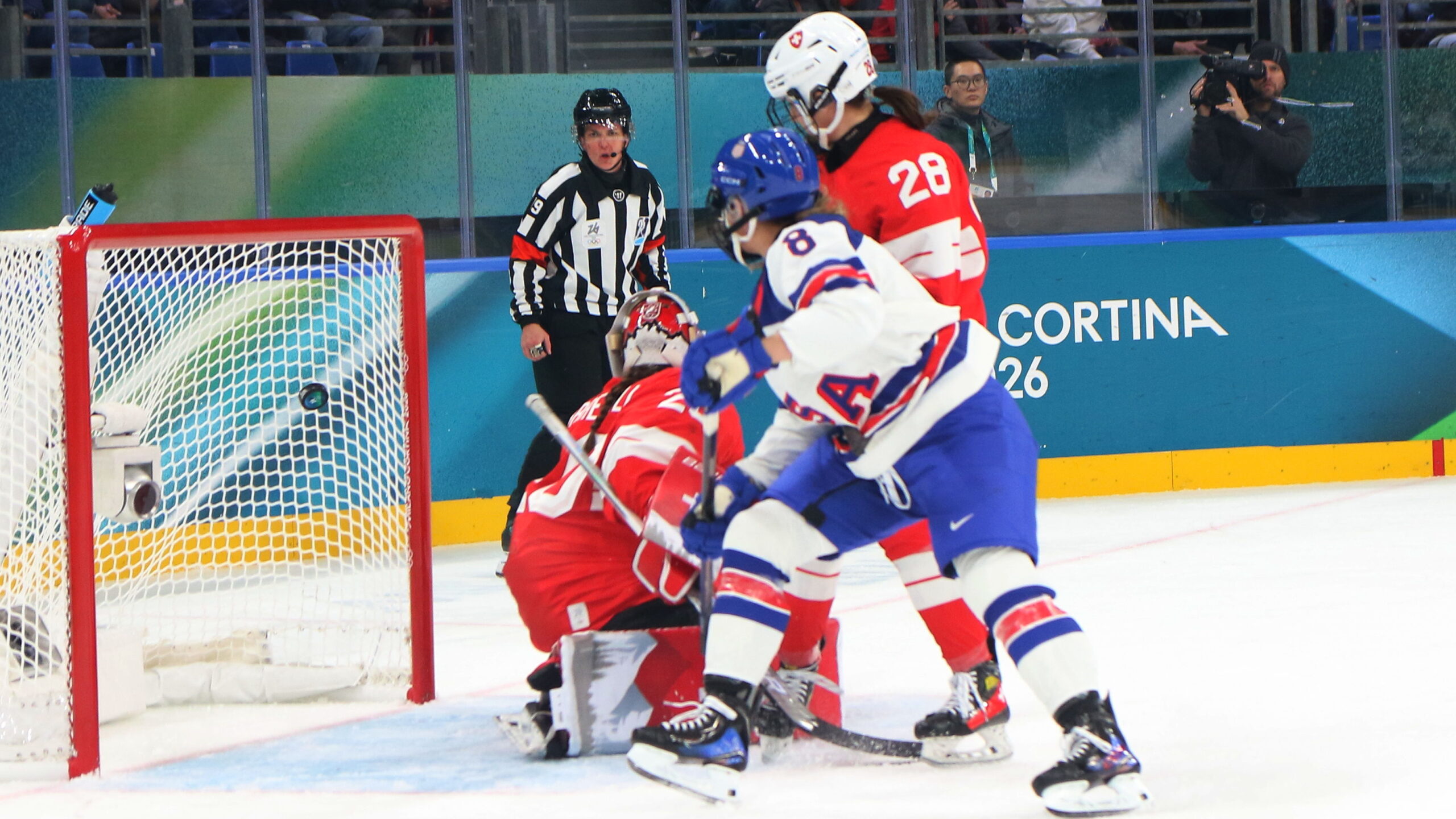 Andrea Brändli #20, A.J. Spellacy #8, Daniil Ustinkov #28, Olympic Games 2026 Womens Hockey SUI – USA, Santagiulia Arena, Milano , © Puckfans.at / Andreas Robanser