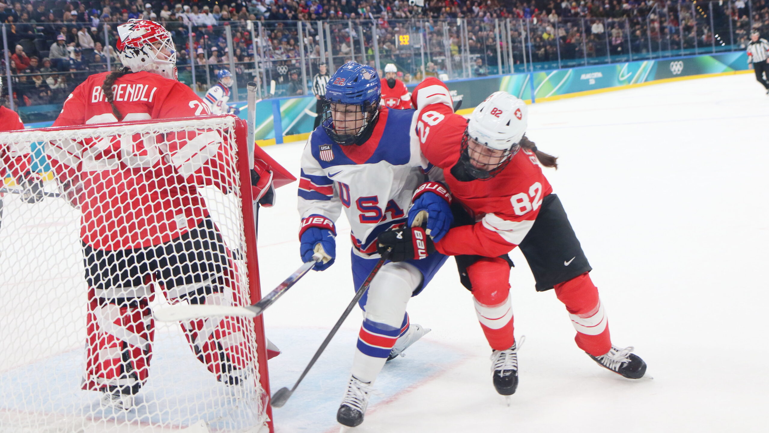 a6T4A5676 9. Februar 2026 2560 × 1440 a6T4A5676 Andrea Brändli #20, Tessa Janecke #22, Alessia Baechler #82, Olympic Games 2026 Womens Hockey SUI – USA, Santagiulia Arena, Milano , © Puckfans.at / Andreas Robanser