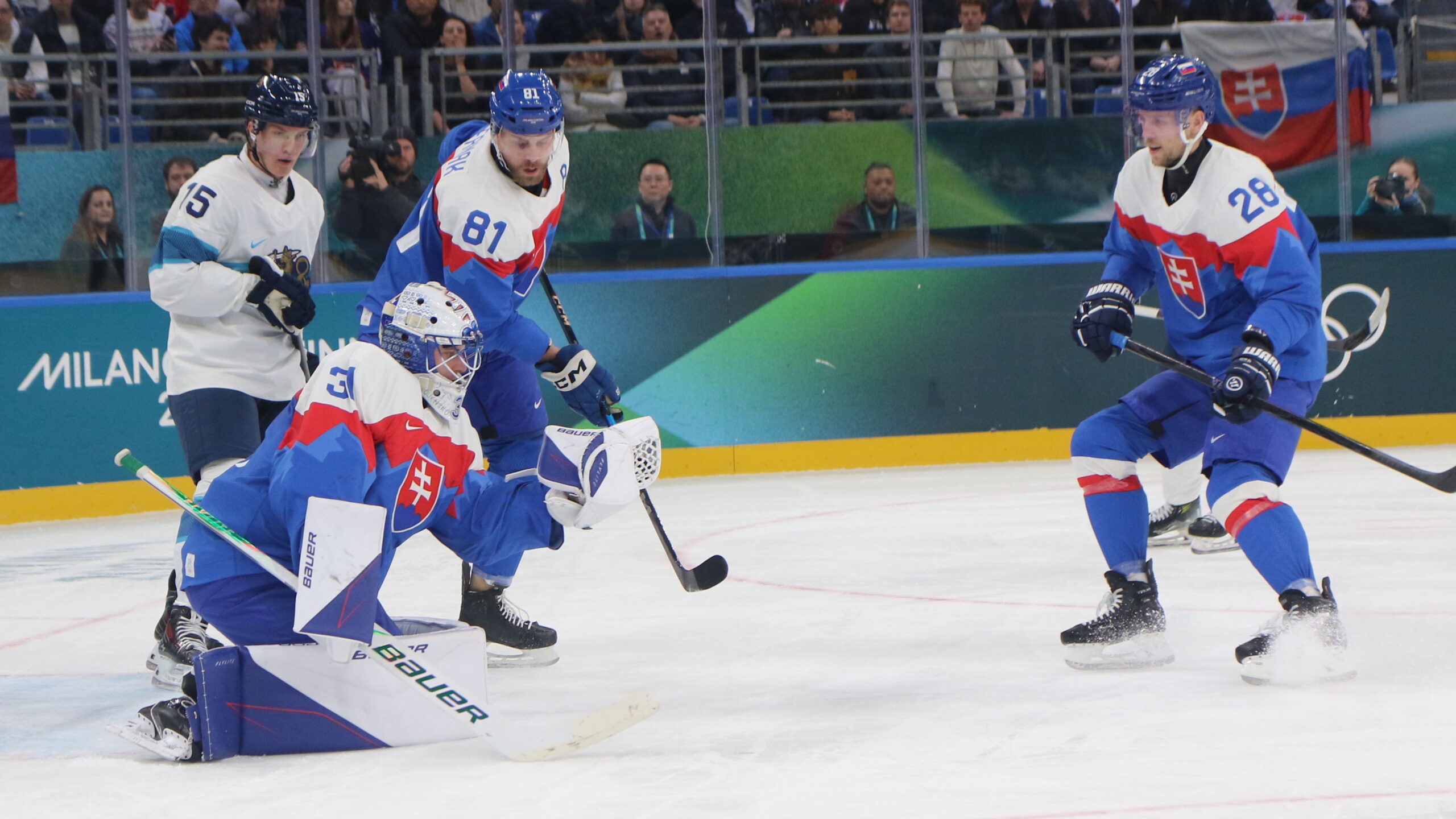 Anton Lundell #15, Samuel Hlavaj #31, Erik Cernak #81, Martin Gernát #28, Olympic Games 2026 Mens Hockey SVK – FIN, Milano Santa Giulia Arena, © Puckfans.at / Andreas Robanser