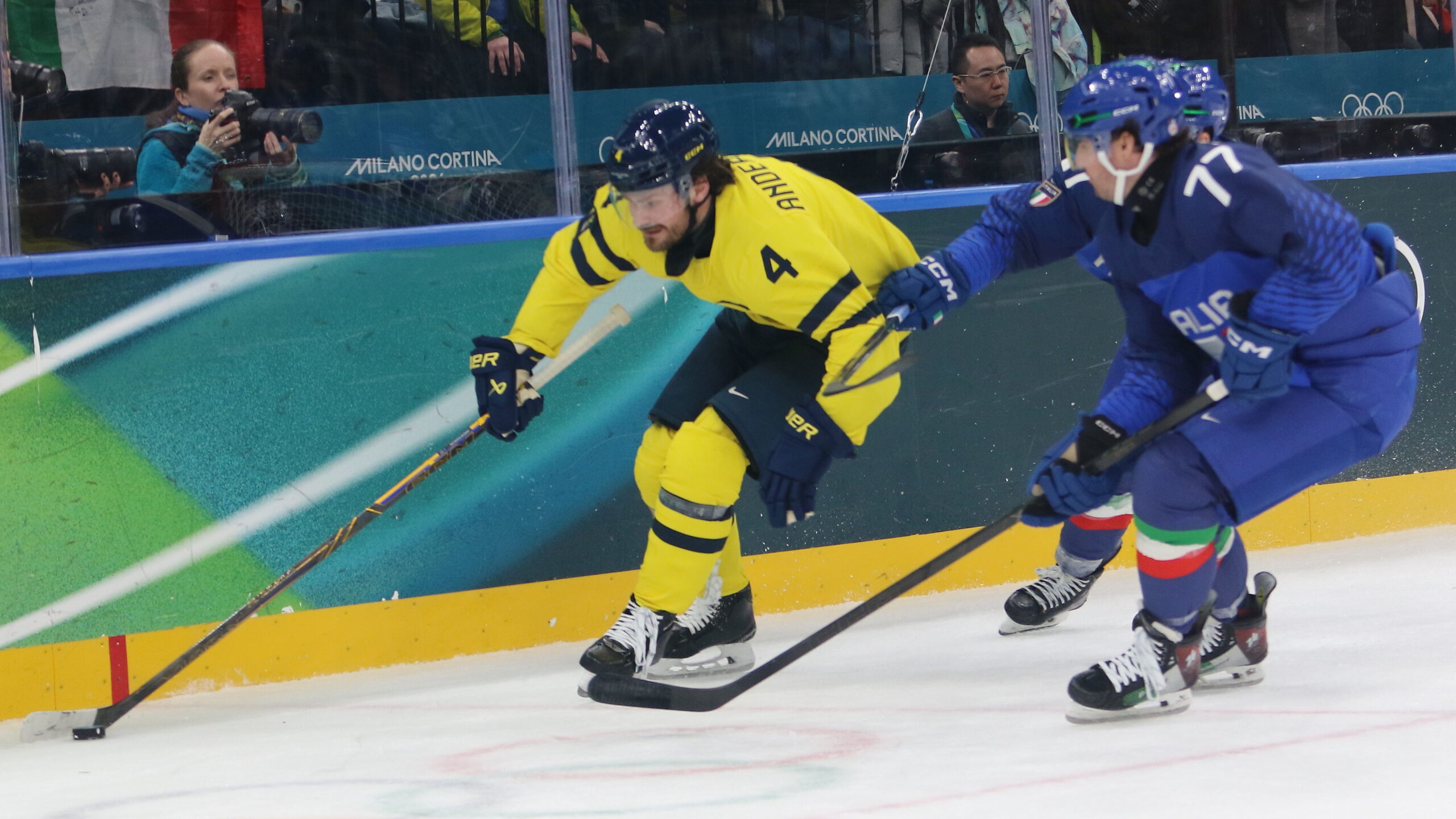 Rasmus Andersson #4, Gregory Di Tomaso #77, Olympic Games 2026 Mens Hockey SWE – ITA, Milano Santa Giulia Arena, © Puckfans.at / Andreas Robanser