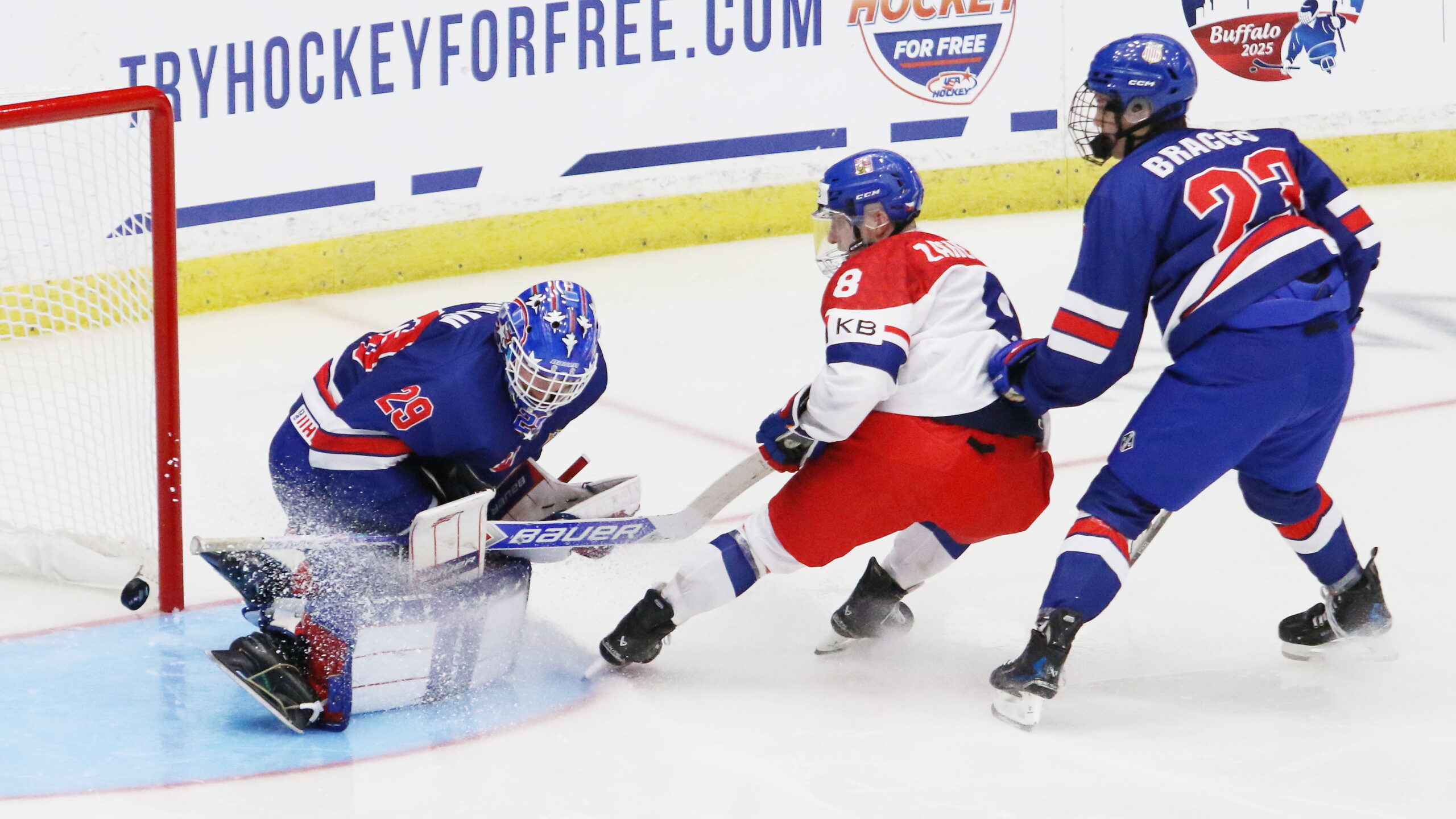 Patrick Quinlan #29, Vít Záhejský #8, Donato Bracco #23, CZE – USA, IIHF U18 Worlds 2025, ComericaCenter, Frisco © Puckfans.at / Andreas Robanser