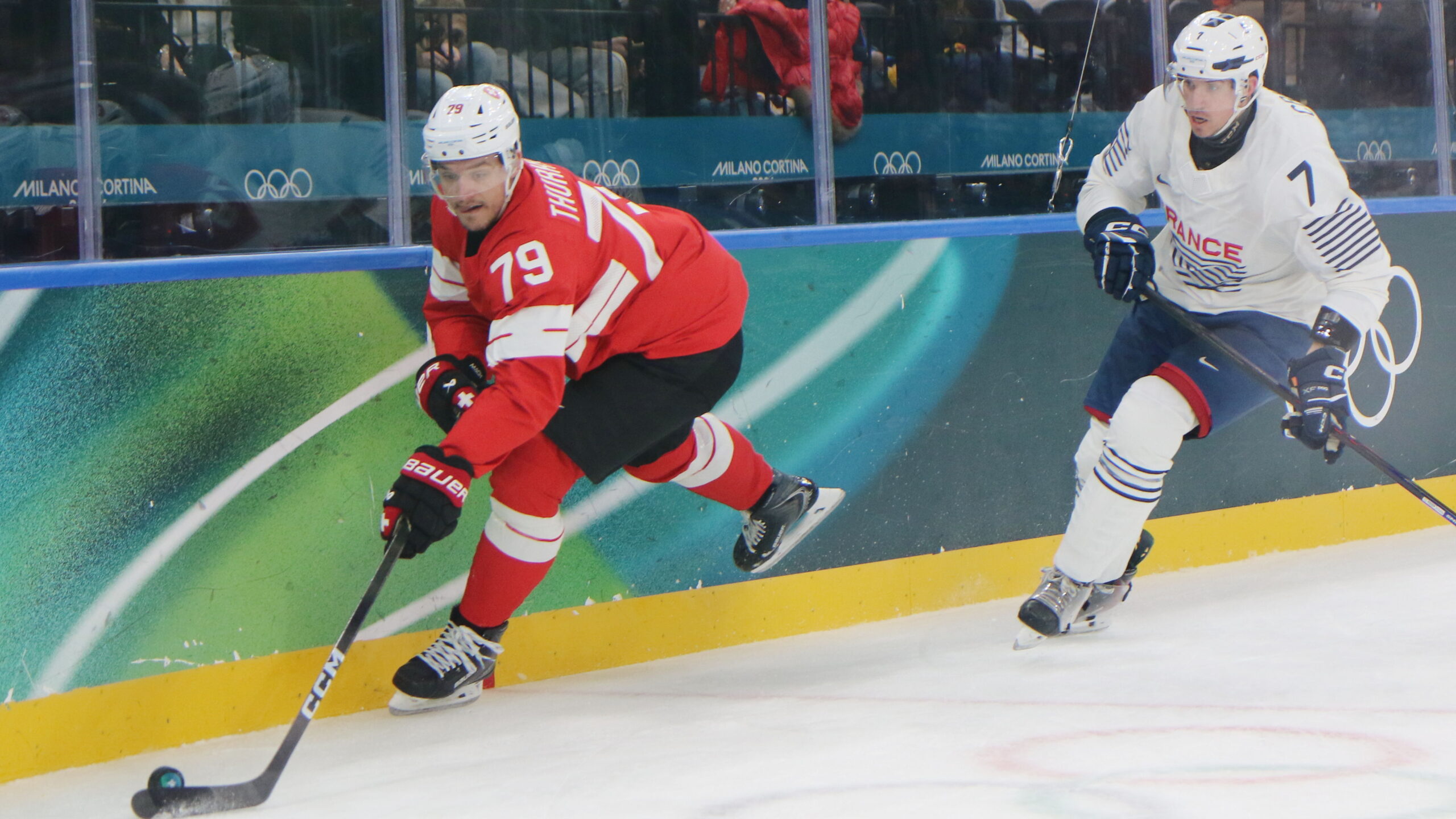 a6T4A7224 12. Februar 2026 2560 × 1440 a6T4A7224 Calvin Thürkauf #79, Pierre Crinon #7, Olympic Games 2026 Mens Hockey SUI – FRA, Milano Santa Giulia Arena, © Puckfans.at / Andreas Robanser