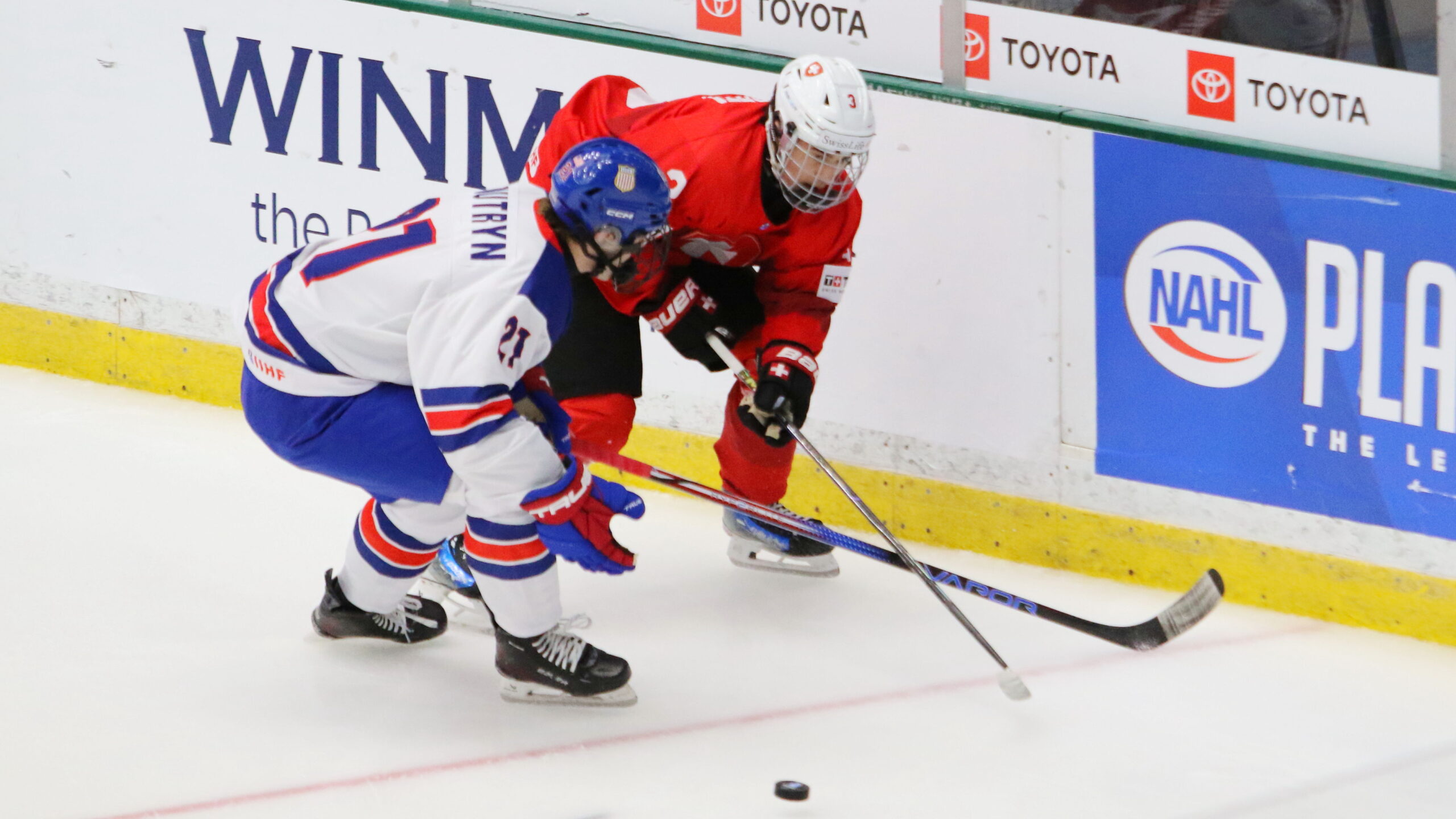 Teddy Mutryn #21, Elia Pedrotti #3, SUI – USA, IIHF U18 Worlds 2025, Comerica Center, Frisco © Puckfans.at / Andreas Robanser