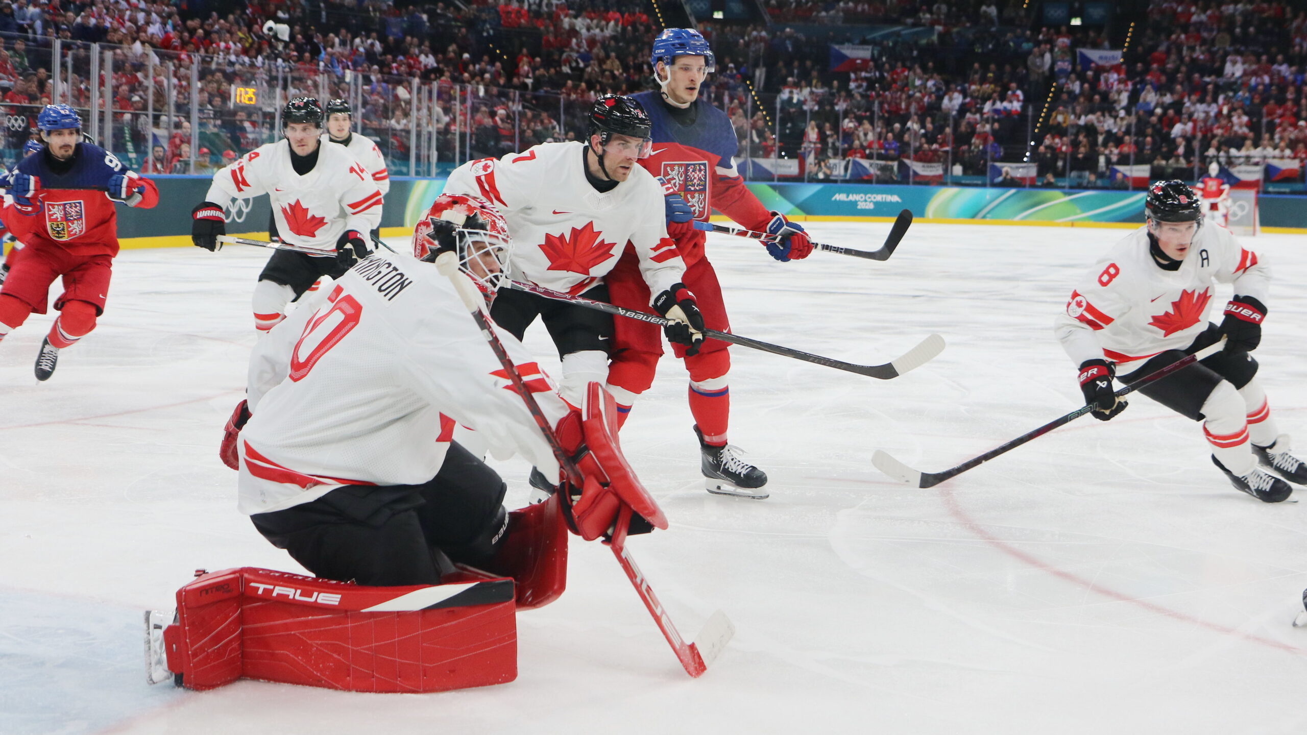 Bo Horvat #14, Jordan Binnington #50, Devon Toews #7, Cale Makar #8, Olympic Games 2026 Mens Hockey CZE – CAN, Milano Santa Giulia Arena, © Puckfans.at / Andreas Robanser