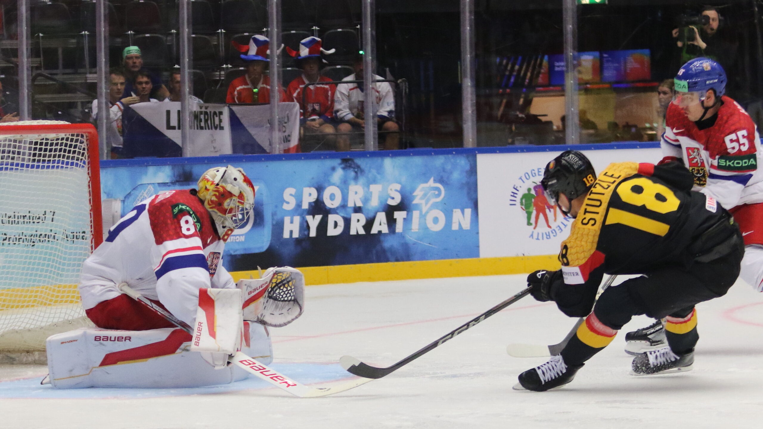 Dan Vladař #80, Tim Stützle #18, Libor Hájek #55, IIHF World Championship 2025 GER – CZE