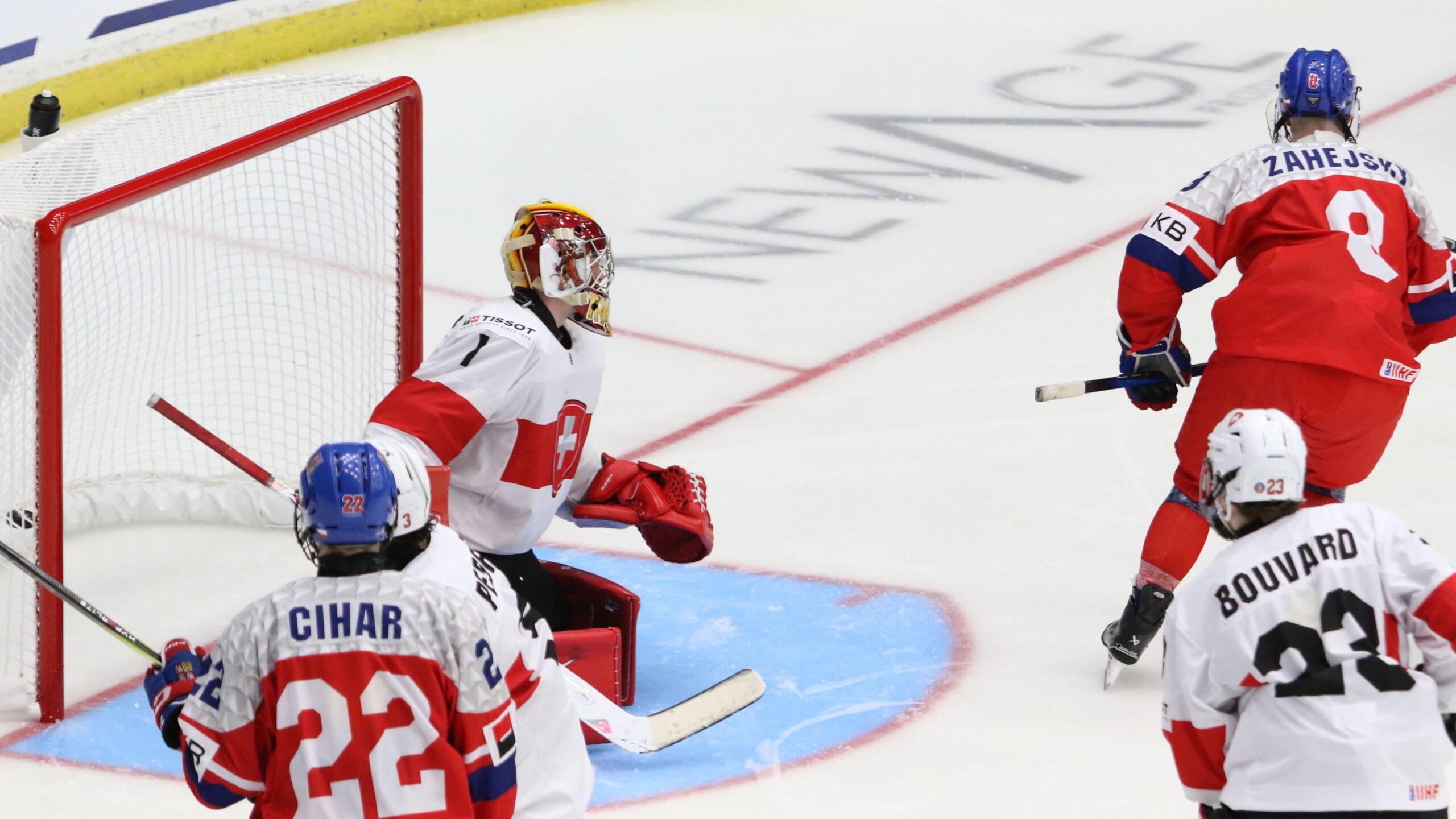 Vojtěch Čihař #22, Jovin Trachsel #1, Vít Záhejský #8, Fabrice Bouvard #23, SUI – CZE, IIHF U18 Worlds 2025, Comerica Center, Frisco © Puckfans.at / Andreas Robanser