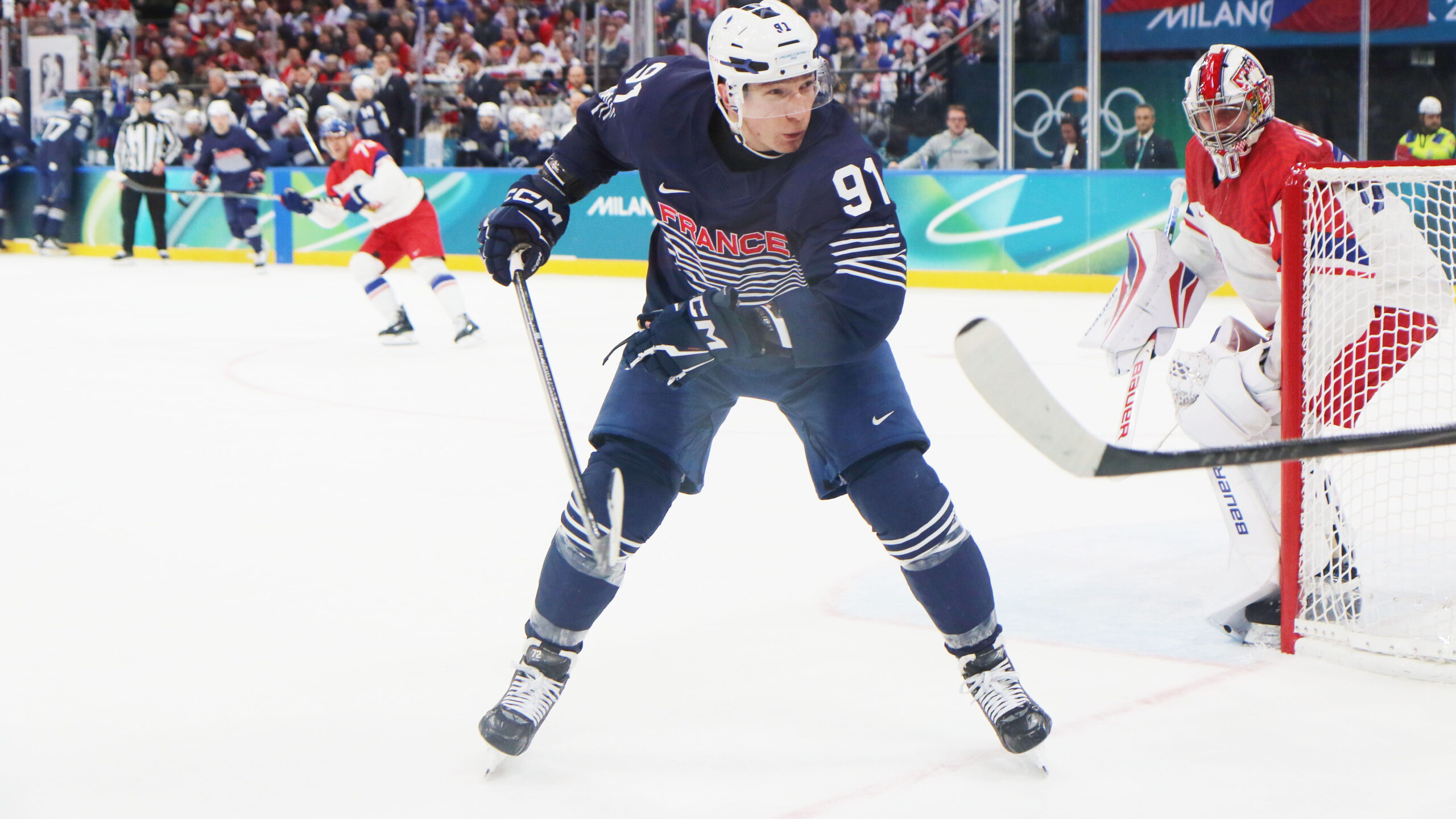 a6T4A8543 13. Februar 2026 2560 × 1440 a6T4A8543 Floran Douay #91,Daniel Vladar #80 , Olympic Games 2026 Mens Hockey FRA – CZE, Milano Santa Giulia Arena, © Puckfans.at / Andreas Robanser