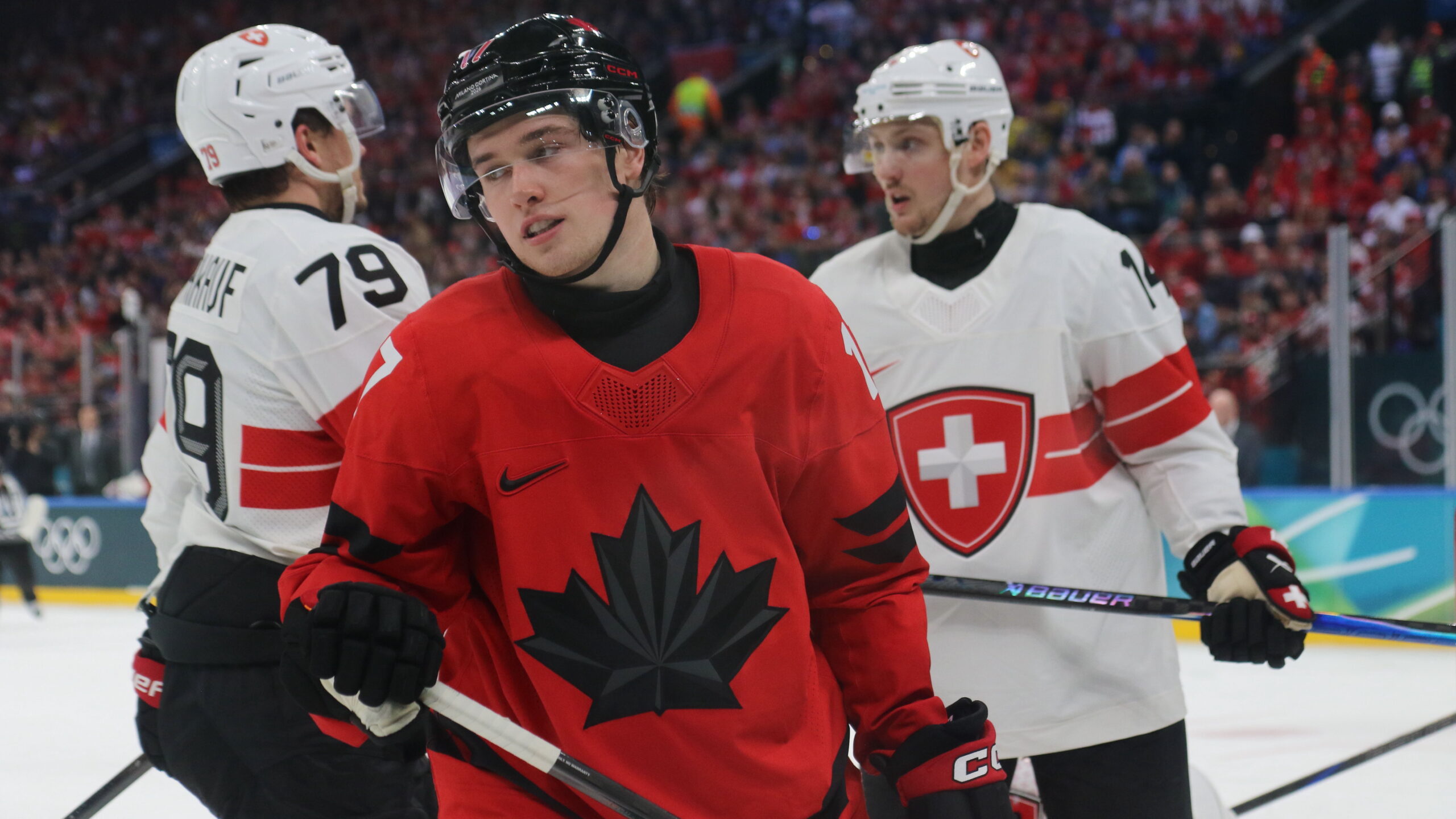 Calvin Thürkauf #79,osui-14 #14, Macklin Celebrini #17, Olympic Games 2026 Mens Hockey CAN – SUI, Milano Santa Giulia Arena, © Puckfans.at / Andreas Robanser