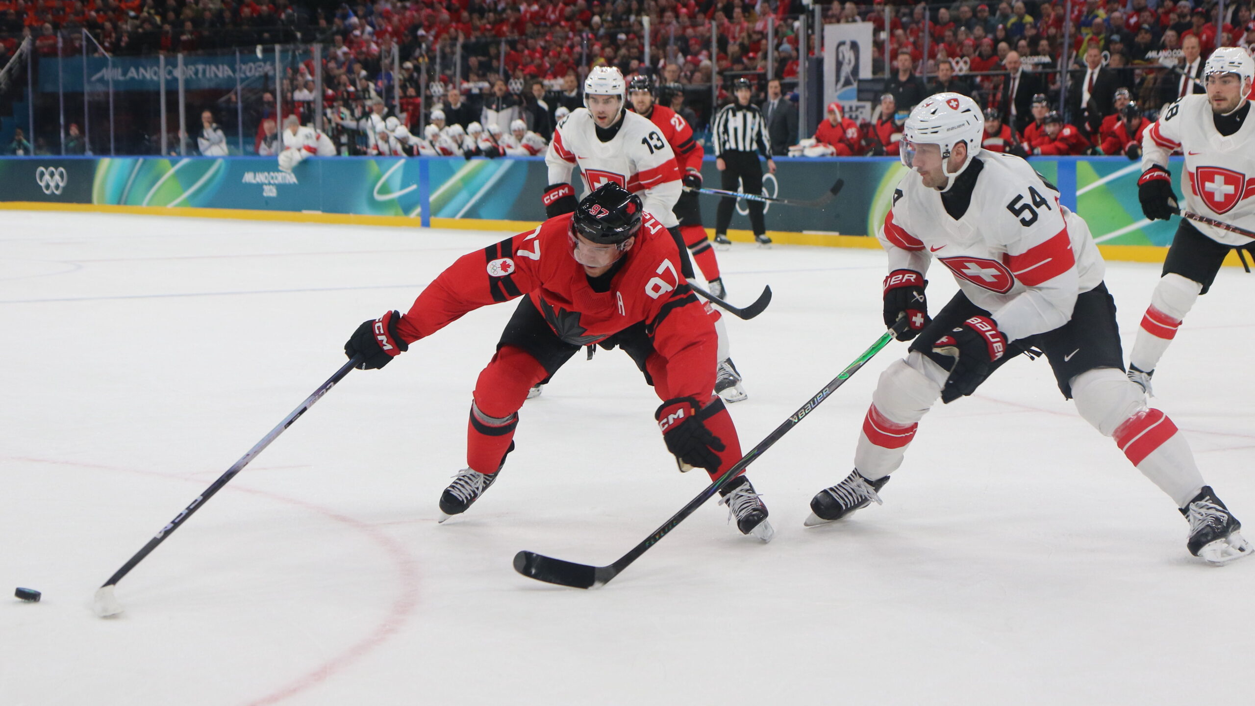 Connor McDavid #97, Nico Hischier #13, Christian Marti #54, Olympic Games 2026 Mens Hockey CAN – SUI, Milano Santa Giulia Arena, © Puckfans.at / Andreas Robanser