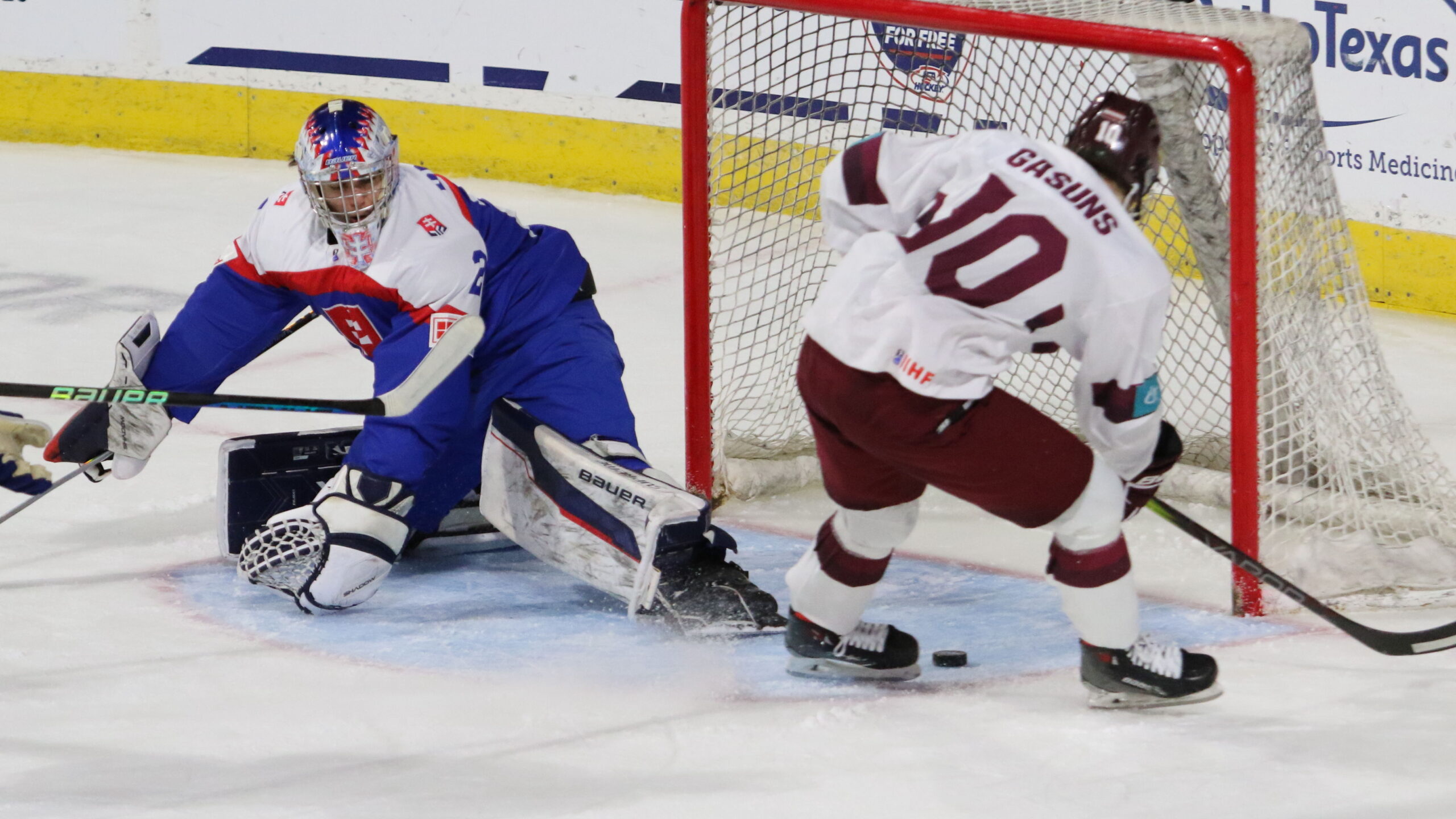 a6T4A8958 28. April 2025 2560 × 1440 a6T4A8958 Michal Pradel #2, Roberts Gasuns #10, SVK – LAT, IIHF U18 Worlds 2025, Credit Union of Texas Event Center © Puckfans.at / Andreas Robanser