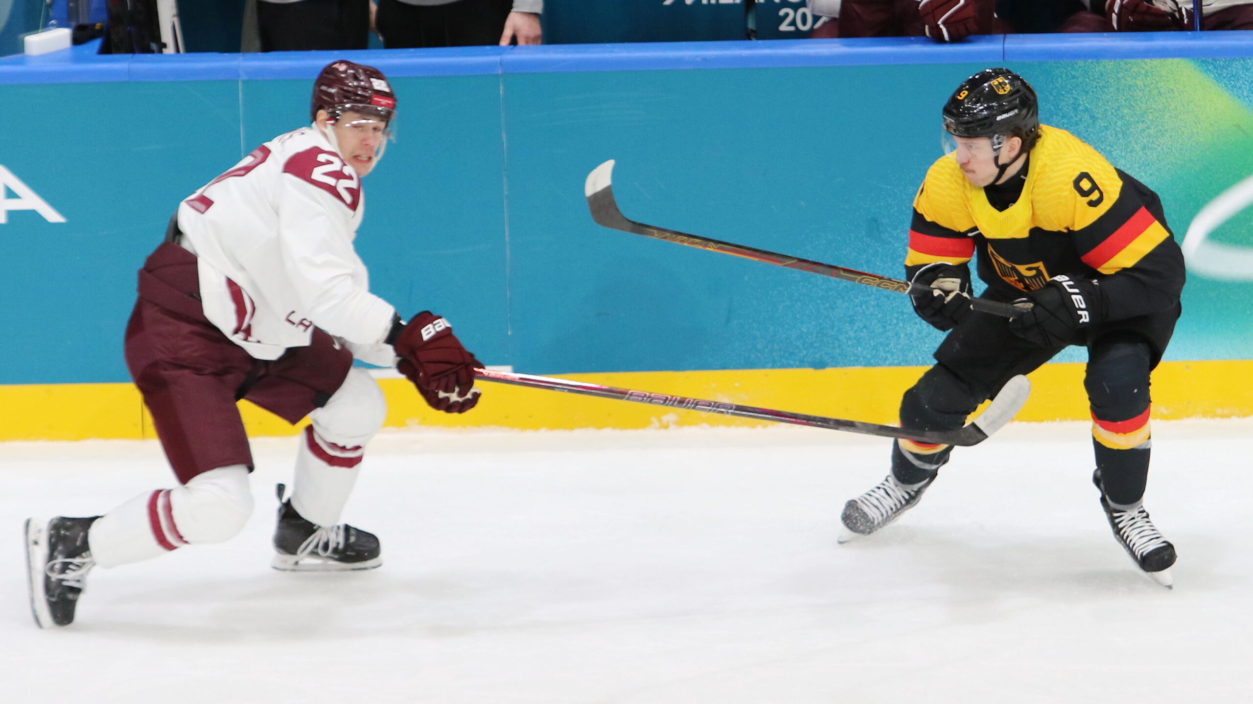 Sandis Vilmanis #22, Leon Gawanke #9, Olympic Games 2026 Mens Hockey GER – LAT, Milano Ice Park, © Puckfans.at / Andreas Robanser