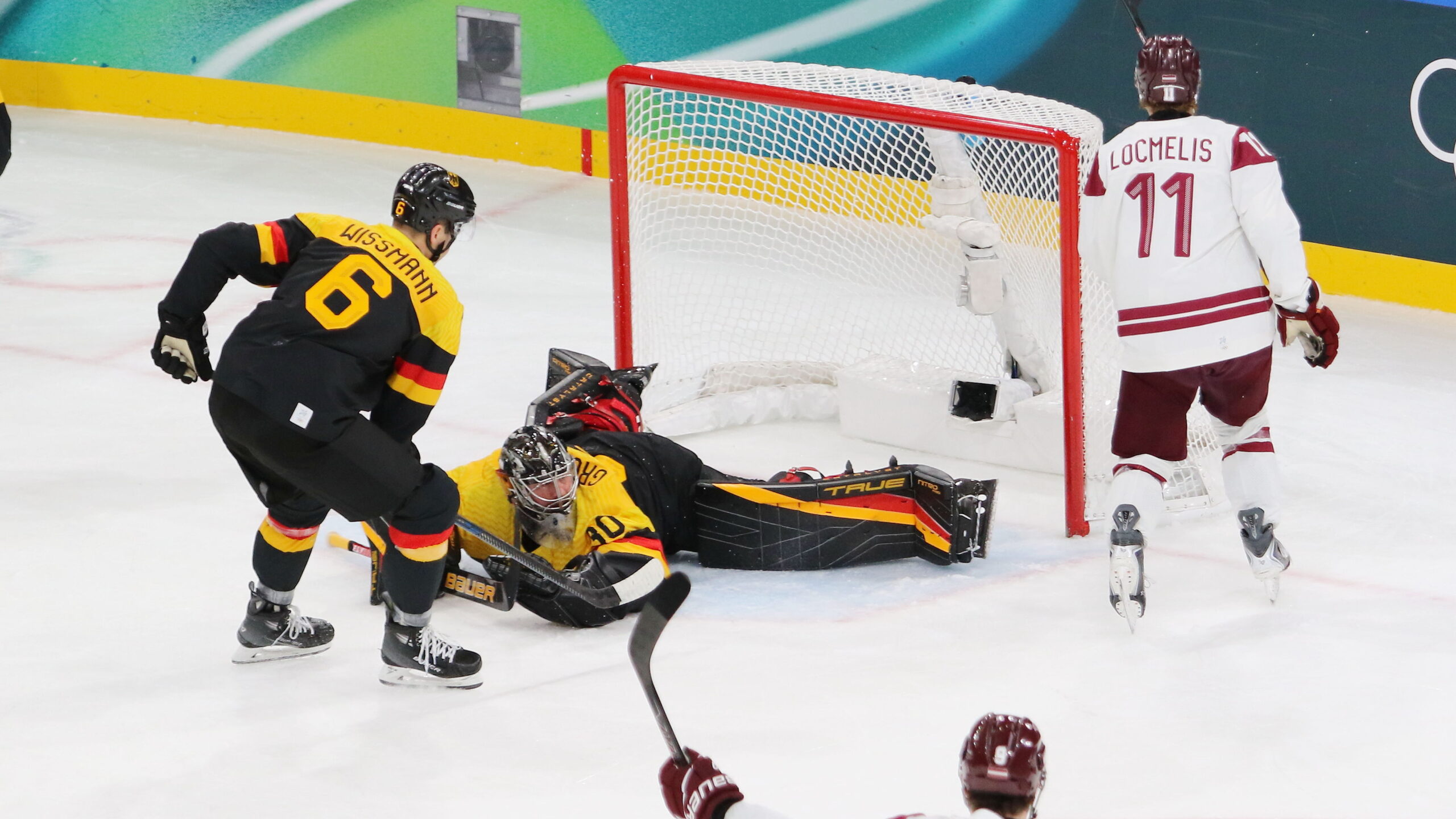 Kai Wissman #6, Philipp Grubauer #30,olat-11 #11, Renars Krastenbergs #9, Olympic Games 2026 Mens Hockey GER – LAT, Milano Ice Park, © Puckfans.at / Andreas Robanser