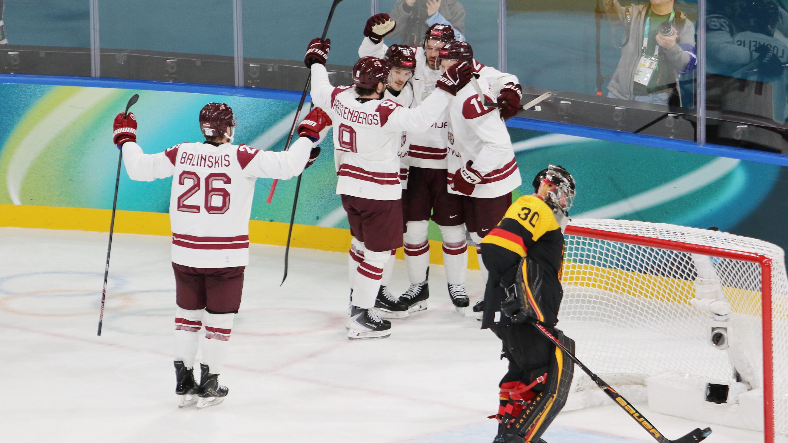 Uvis Balinskis #26, Renars Krastenbergs #9, Dans Locmelis #11, Rudolfs Balcers #21, Philipp Grubauer #30, Olympic Games 2026 Mens Hockey GER – LAT, Milano Ice Park, © Puckfans.at / Andreas Robanser