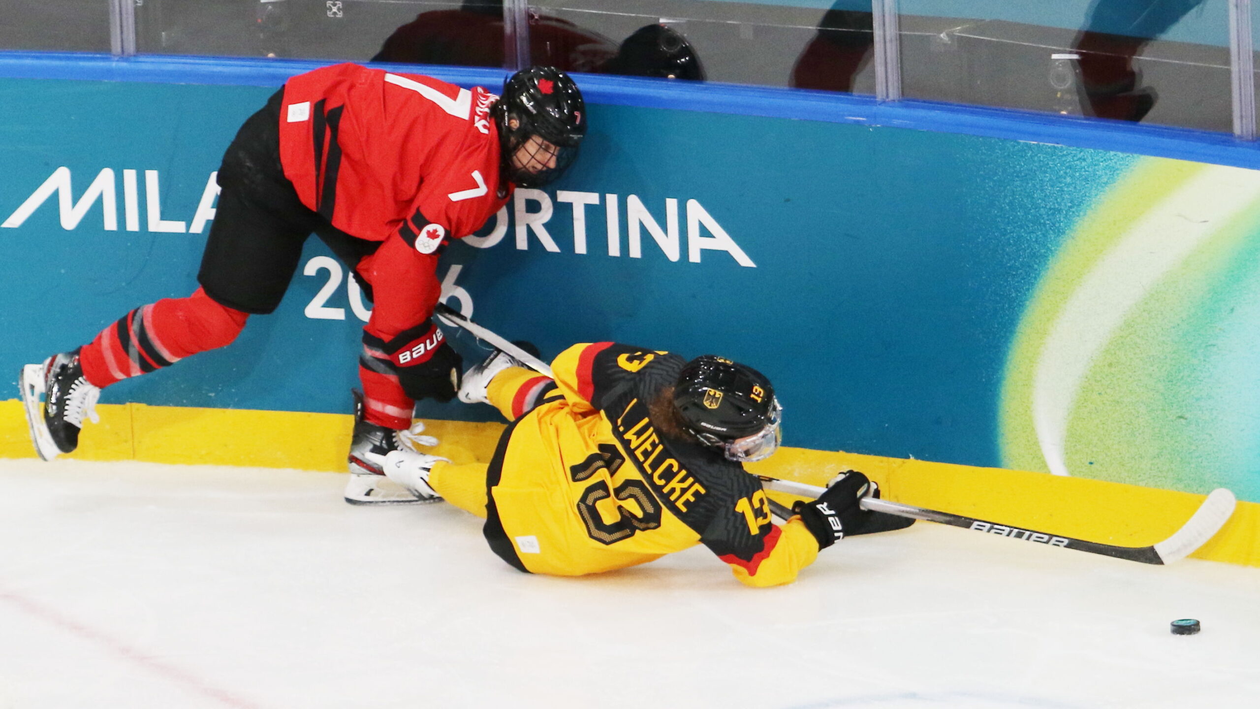 a6T4A9400 14. Februar 2026 2560 × 1440 a6T4A9400 Laura Stacey #7, Luisa Welcke #13, Olympic Games 2026 Womens Hockey QF CAN – GER, Milano Ice Park, © Puckfans.at / Andreas Robanser