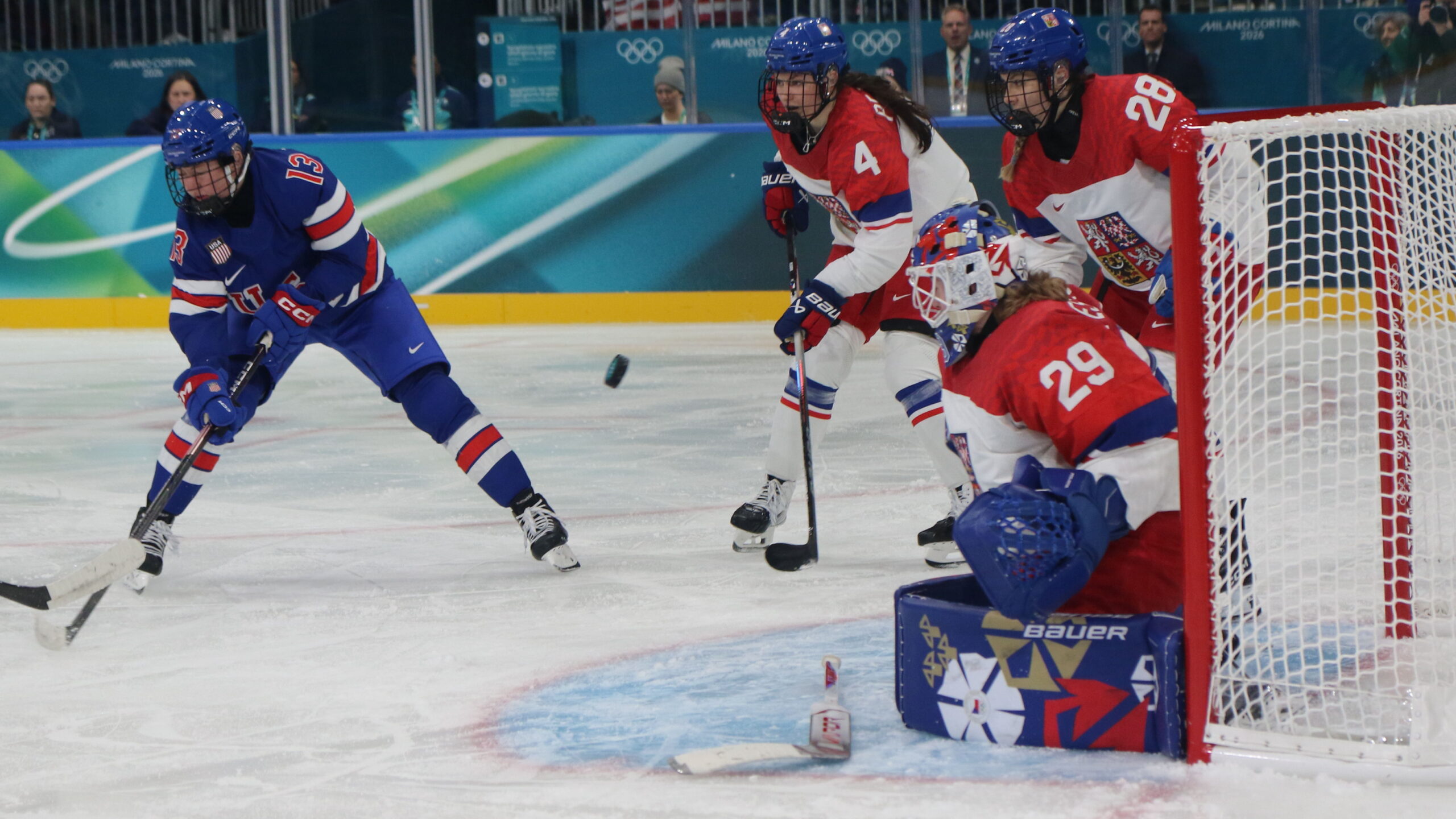 a6T4A9408 5. Februar 2026 2560 × 1440 a6T4A9408 Grace Zumwinkle #13, Daniela Pejsova #4, Noemi Neubauerová #28, Klára Peslarová #29, Olympic Games 2026 Womens Hockey USA – CZE, Milano Rho, © Puckfans.at / Andreas Robanser