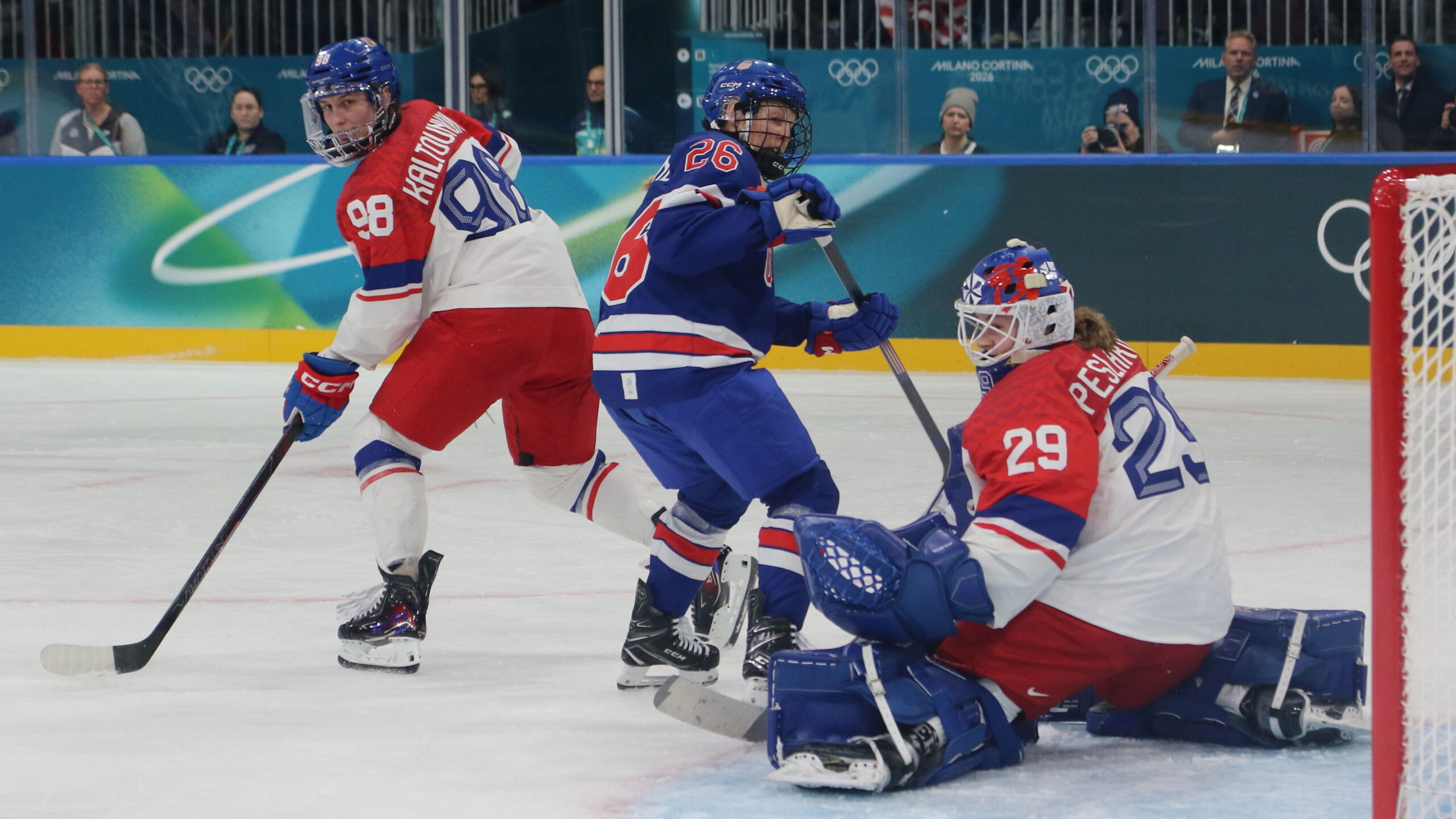 Kristýna Kaltounková #98, Kendall Coyne Schofield #26, Klára Peslarová #29, Olympic Games 2026 Womens Hockey USA – CZE, Milano Rho, © Puckfans.at / Andreas Robanser