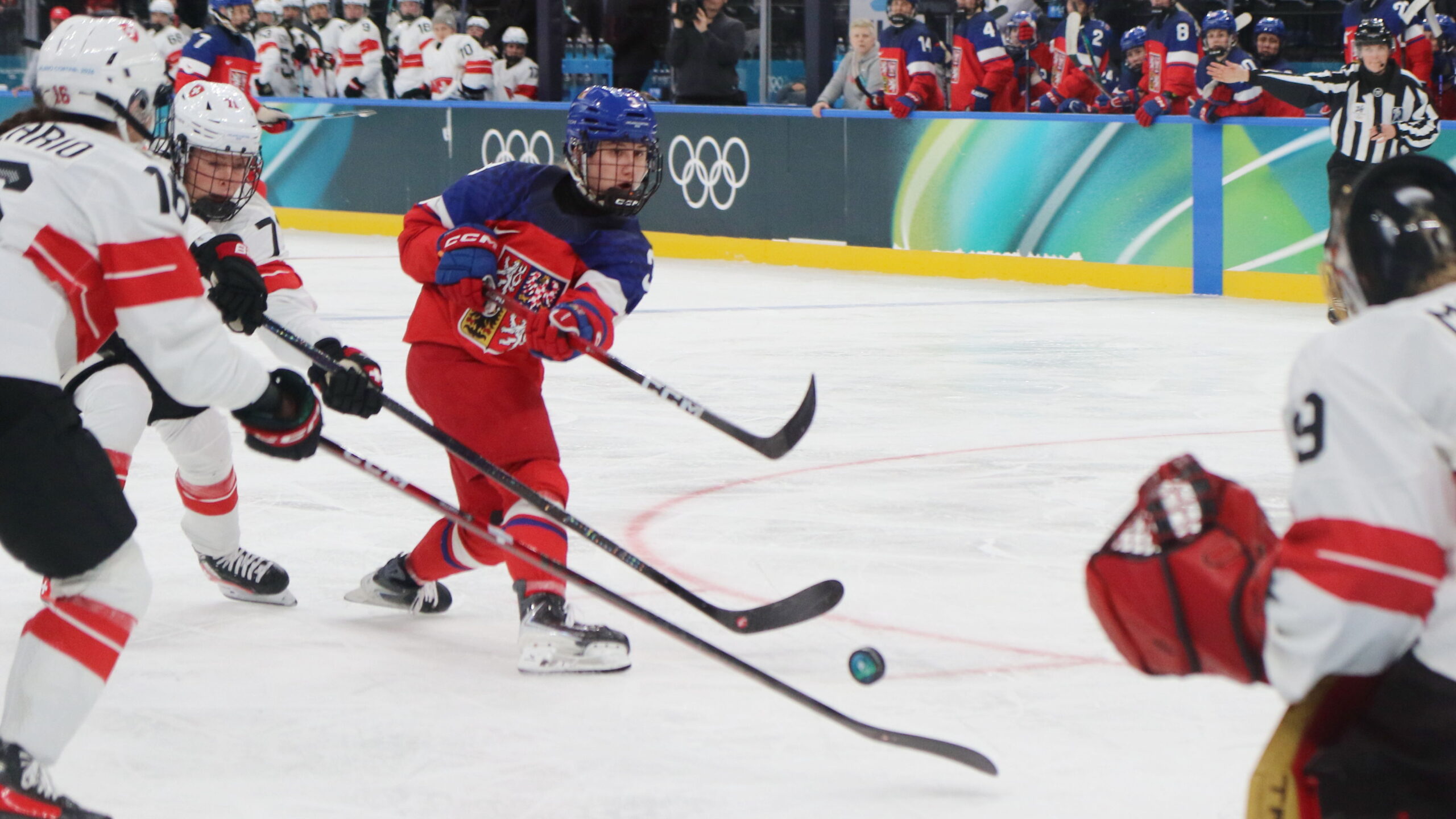 Nicole Vallario #16, Linda Vocetková #6, Saskia Maurer #29, Olympic Games 2026 Womens Hockey CZE – SUI, Milano Santagiulia Arena, © Puckfans.at / Andreas Robanser