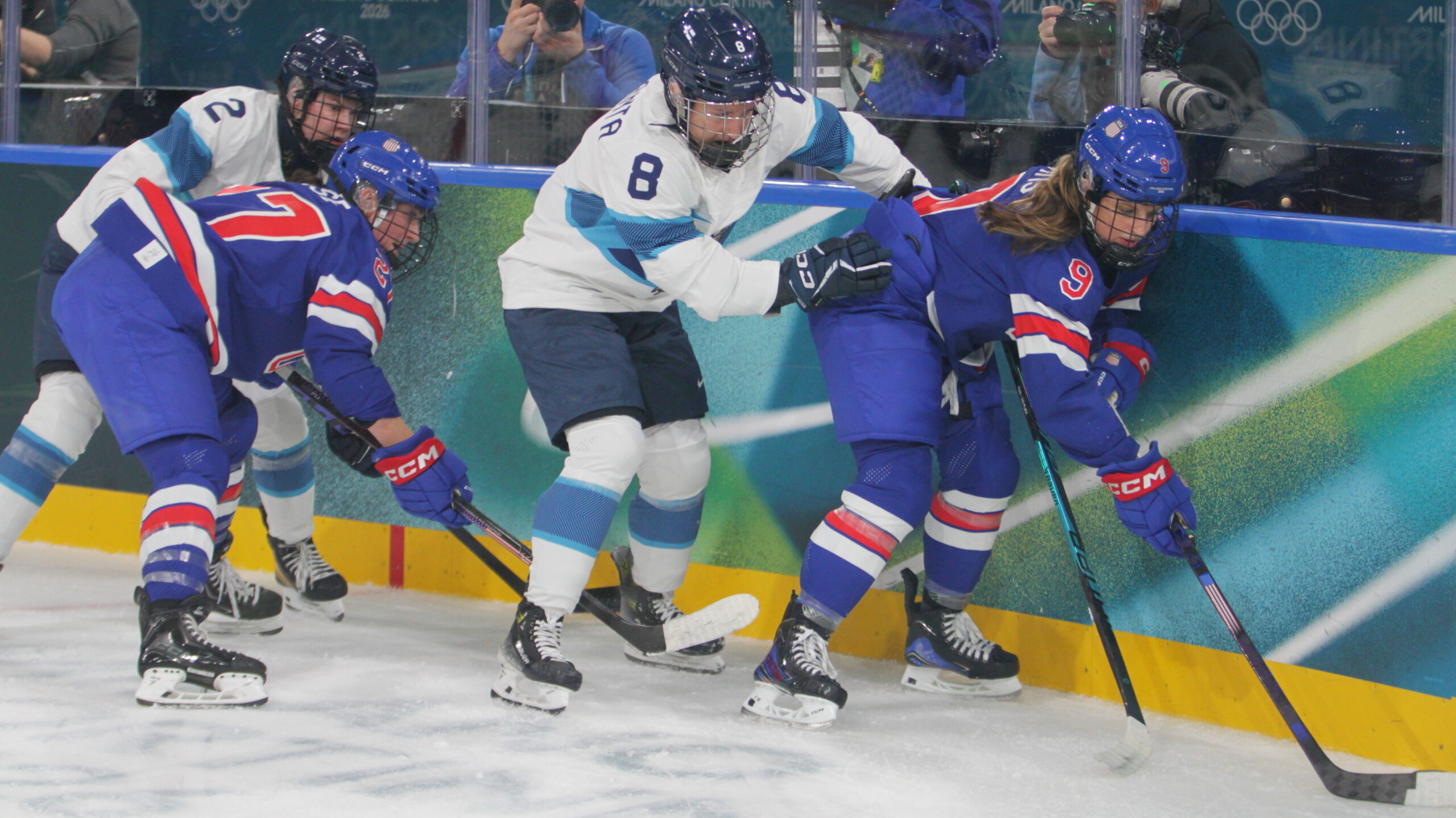 Sini Karjalainen #2, Taylor Heise #27, Elli Suoranta #8, Kirsten Simms #9, Olympic Games 2026 Womens Hockey USA – FIN, Milano Rho Ice Park, © Puckfans.at / Andreas Robanser
