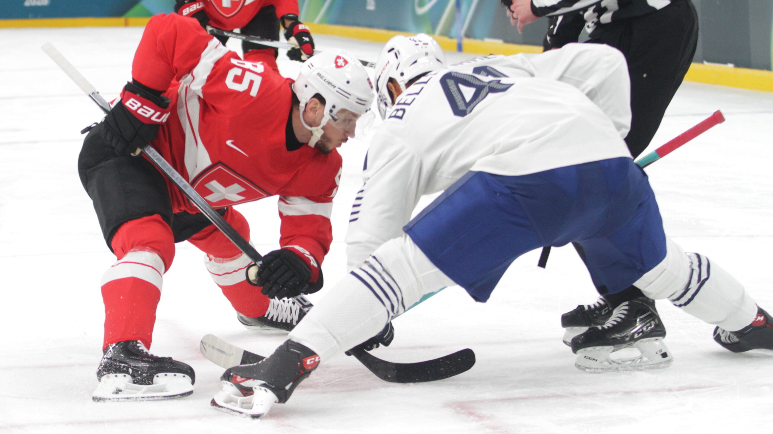 Sven Andrighetto #85, Pierre-Édouard Bellemare #41, Olympic Games 2026 Mens Hockey SUI – FRA, Milano Santa Giulia Arena, © Puckfans.at / Andreas Robanser
