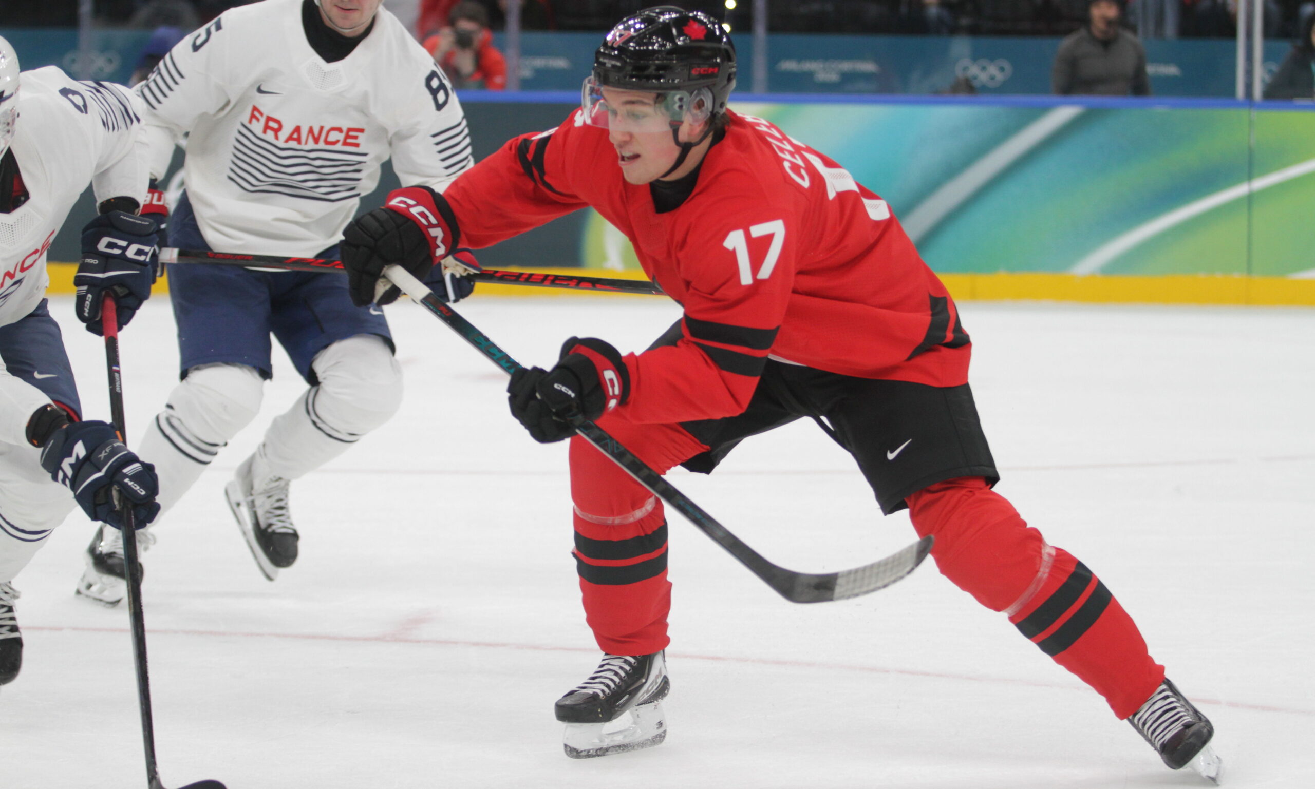 Alexandre Texier #85, Macklin Celebrini #17, Olympic Games 2026 Mens Hockey CAN – FRA , Santa Giulia Arena, Milano © Puckfans.at / Andreas Robanser