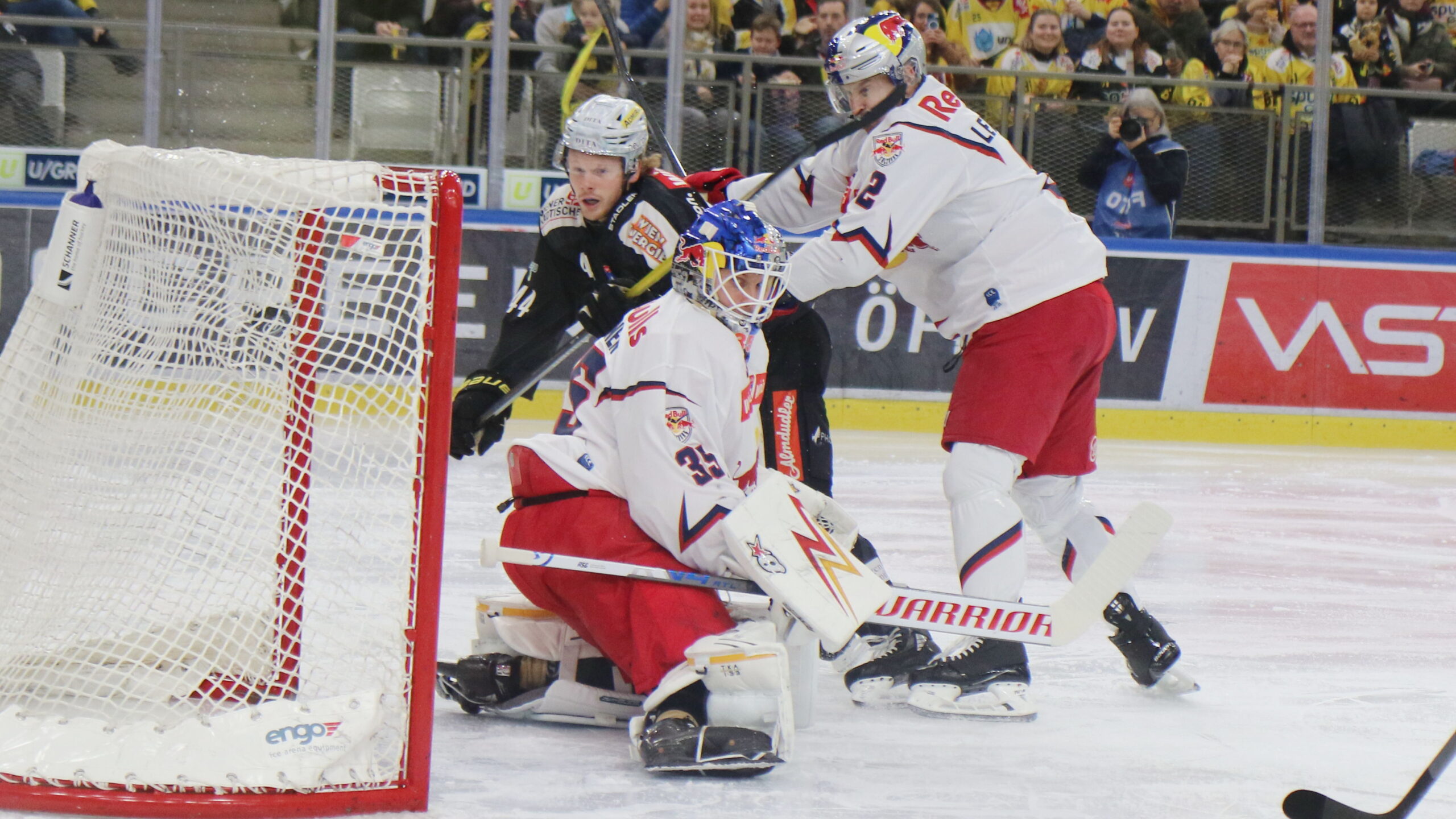 6T4A1442 7. Dezember 2025 2560 × 1440 Am Ende setzte sich in Wien doch der ICEHL Champion durch Carter Souch #44, Atte Tolvanen #35, Tyler Lewington #2, ICEHL Round 28 Vienna Capitals – EC Red Bull Salzburg, Steffl Arena, © Puckfans.at / Andreas Robanser