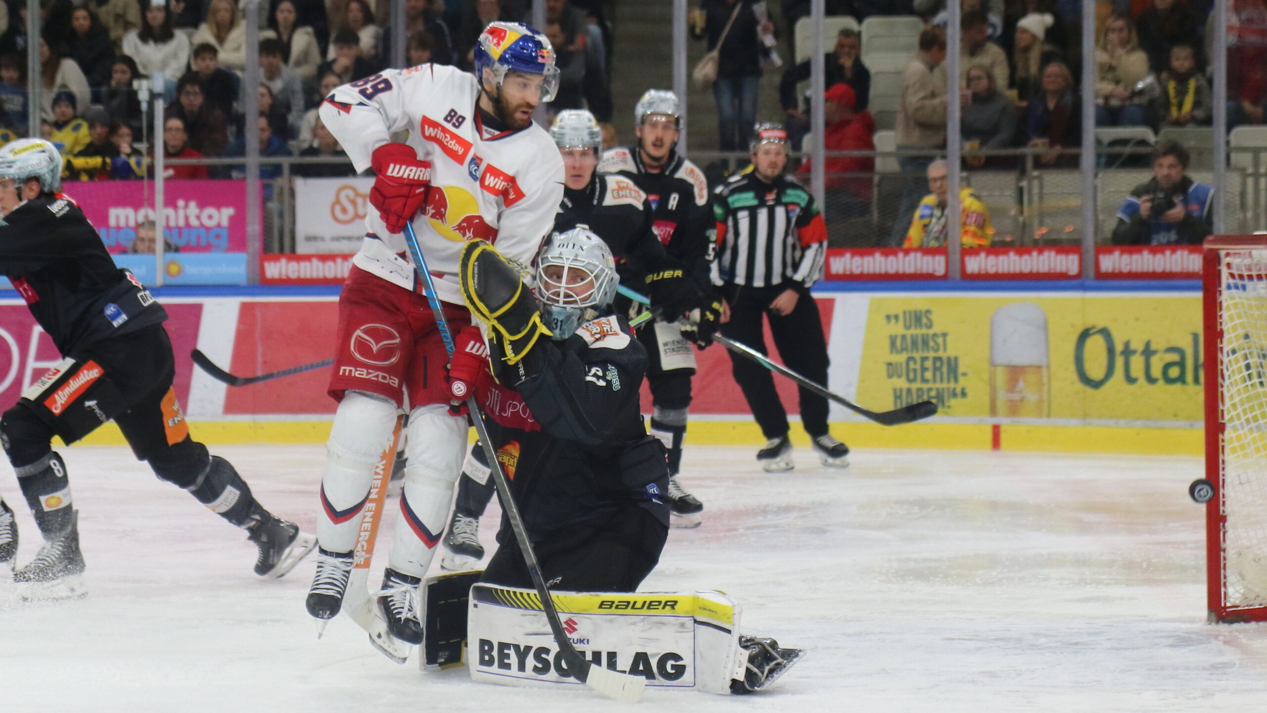 6T4A1582 7. Dezember 2025 2560 × 1440 Am Ende setzte sich in Wien doch der ICEHL Champion durch Florian Baltram #89, Evan Cowley #31, ICEHL Round 28 Vienna Capitals – EC Red Bull Salzburg, Steffl Arena, © Puckfans.at / Andreas Robanser