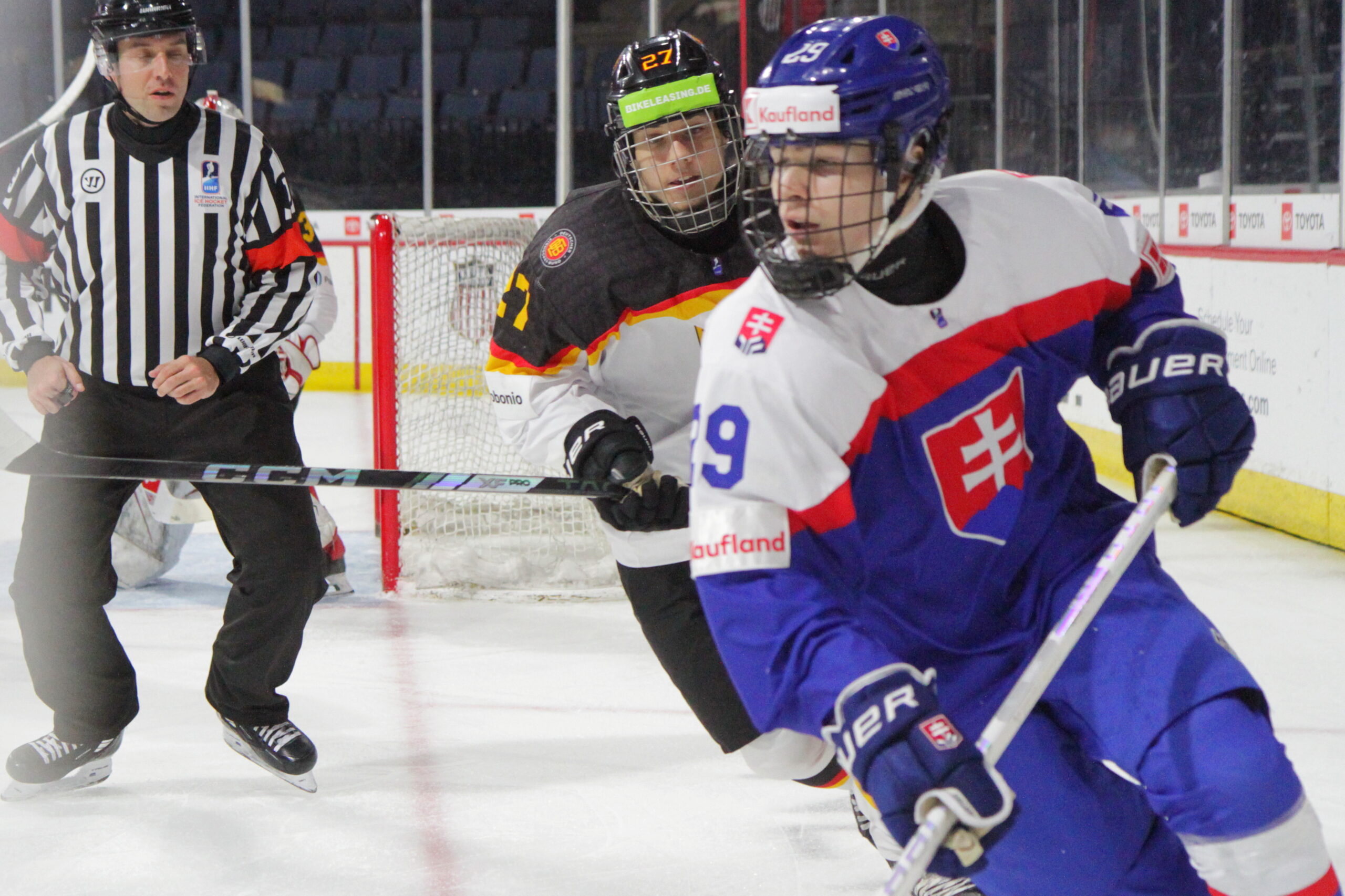 arIMG_8796 30. April 2025 2560 × 1706 arIMG_8796 Rihards Griva #27, Tomas Chrenko #29, QF SVK – GER, IIHF U18 Worlds 2025, Credit Union of Texas Event Center © Puckfans.at / Andreas Robanser
