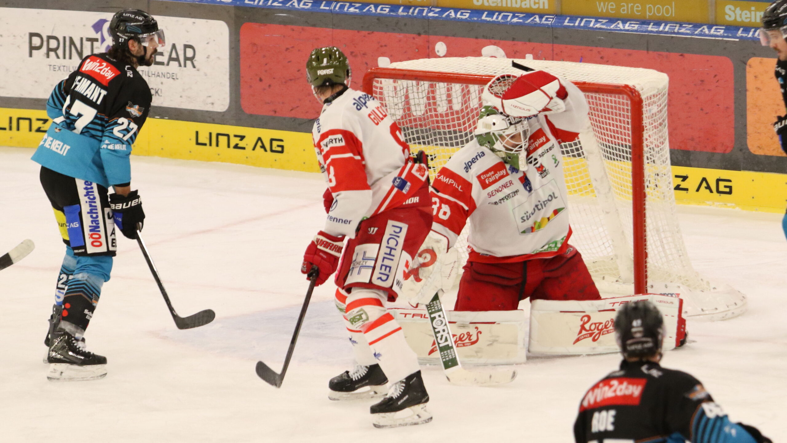 Shawn St-Amant #27, Max Gildon #8, Samuel Harvey #38, ICEHL Round 23 Black Wings Linz – HCB Südtirol, Linz AG Eisarena, © Puckfans.at / Andreas Robanser