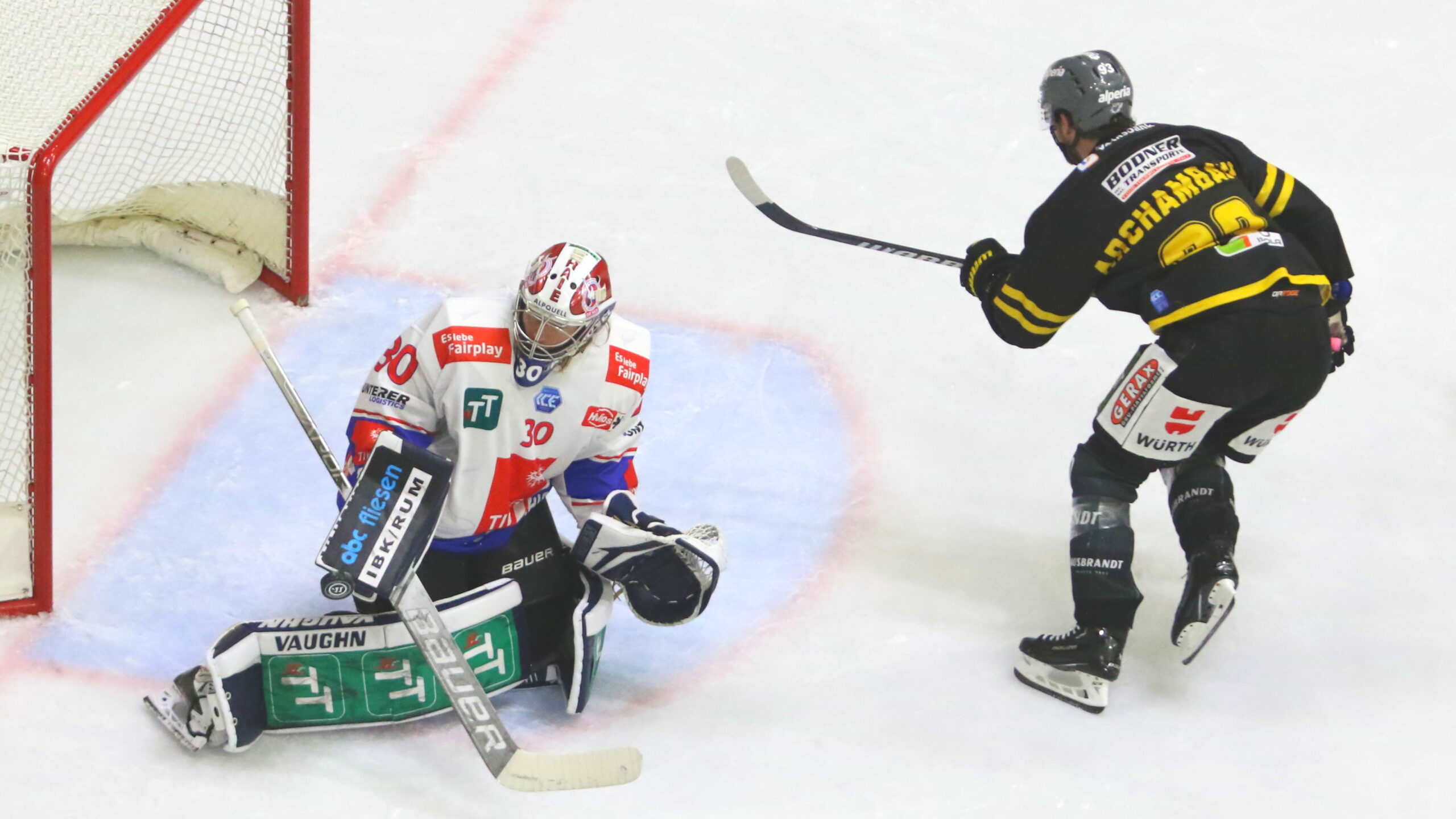 6T4A2016 26. Oktober 2022 2560 × 1440 Bruneck erzielt heute gleich acht Tore ICEHL: HC Pustertal – HC Innsbruck René Swette #30, Olivier Archambault #93 Intercable Arena Bruneck, © Puckfans.at/Andreas Robanser