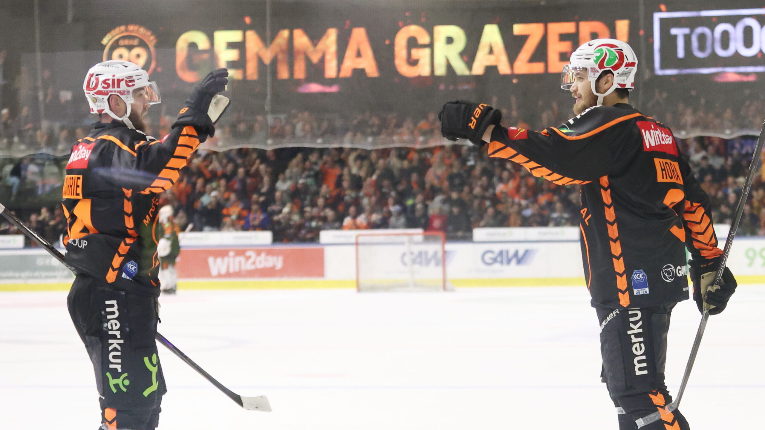 Josh Currie #64, Frank Hora #3, ICEHL Final Game 1 Graz99ers – HC Pustertal, Merkur Eisstadion, © Puckfans.at / Andreas Robanser