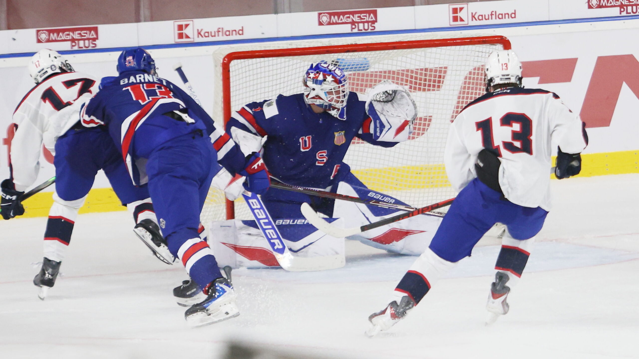Abe Barnett #13, Luke Carrithers #01, Niklas Aaram-Olsen 17, Benjamin Haglund #13, Pre Game U18 World Championship 2026 USA – NOR, Vladimír Dzurilla Arena, Bratislava, © Puckfans.at / Andreas Robanser