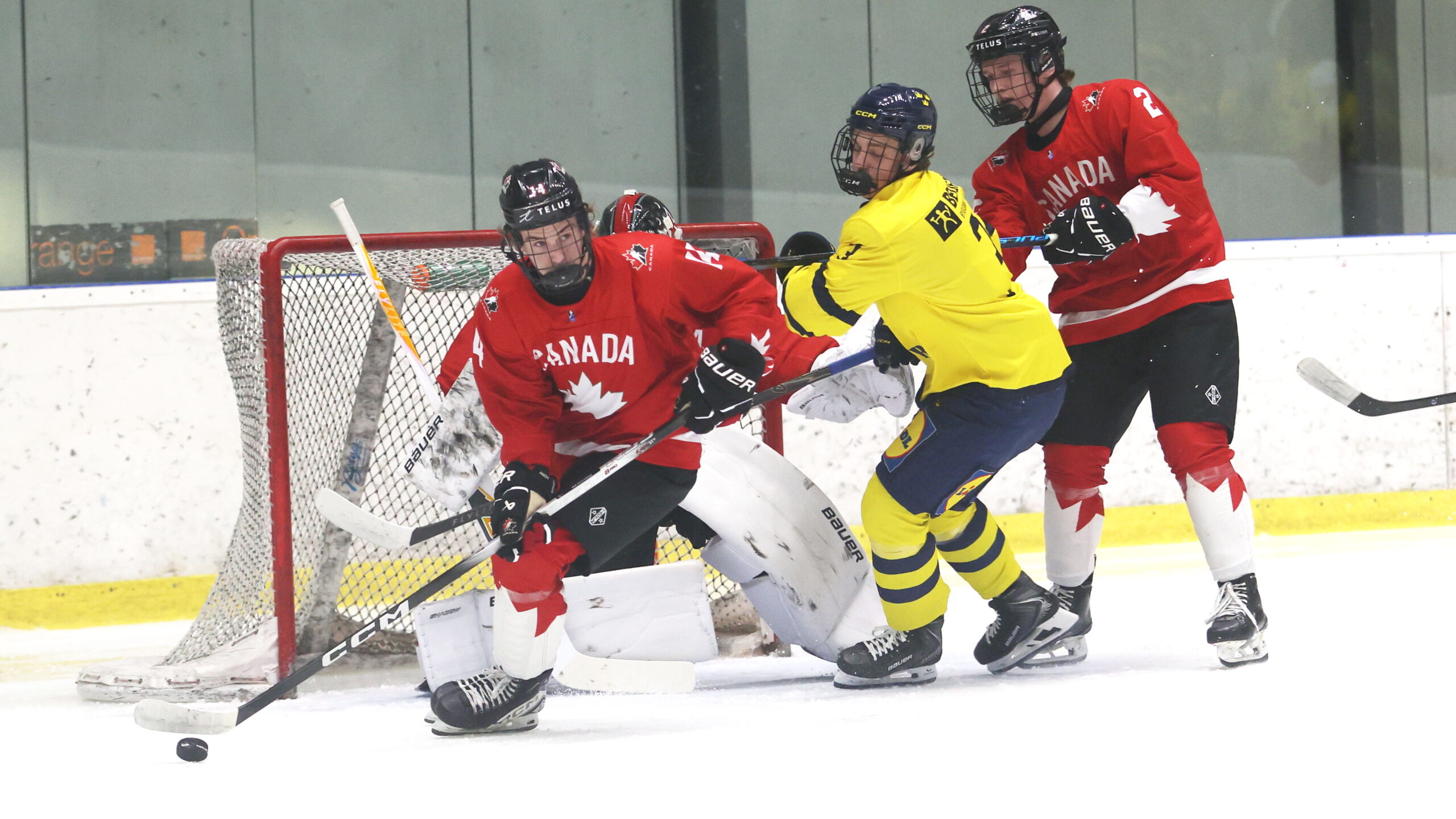Ryan Lin #4, Gavin Betts #1, Zigge Bratt #3, Cameron Chartrand #2, Pre Game U18 World Championship 2026 CAN – SWE, Ondrej Nepela Arena B, Bratislava, © Puckfans.at / Andreas Robanser