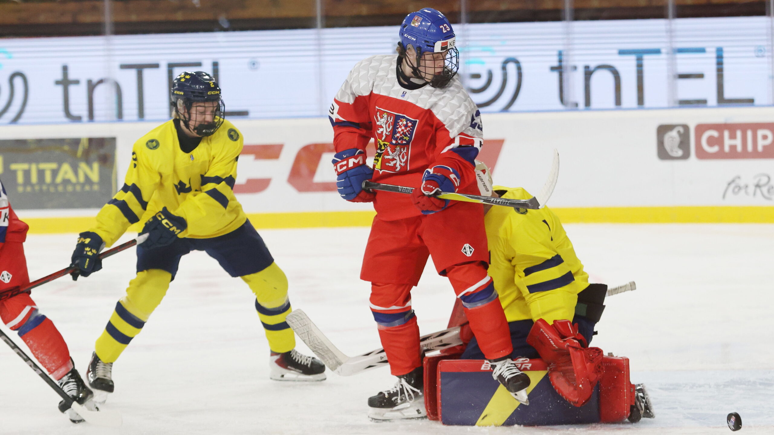 Axel Elofsson #2, Adam Klaus #23, Kevin Törnblom #1, IIHF U18 World Championship 2026 SWE – CZE, Vladimír Dzurilla Arena, Bratislava, © Puckfans.at / Andreas Robanser