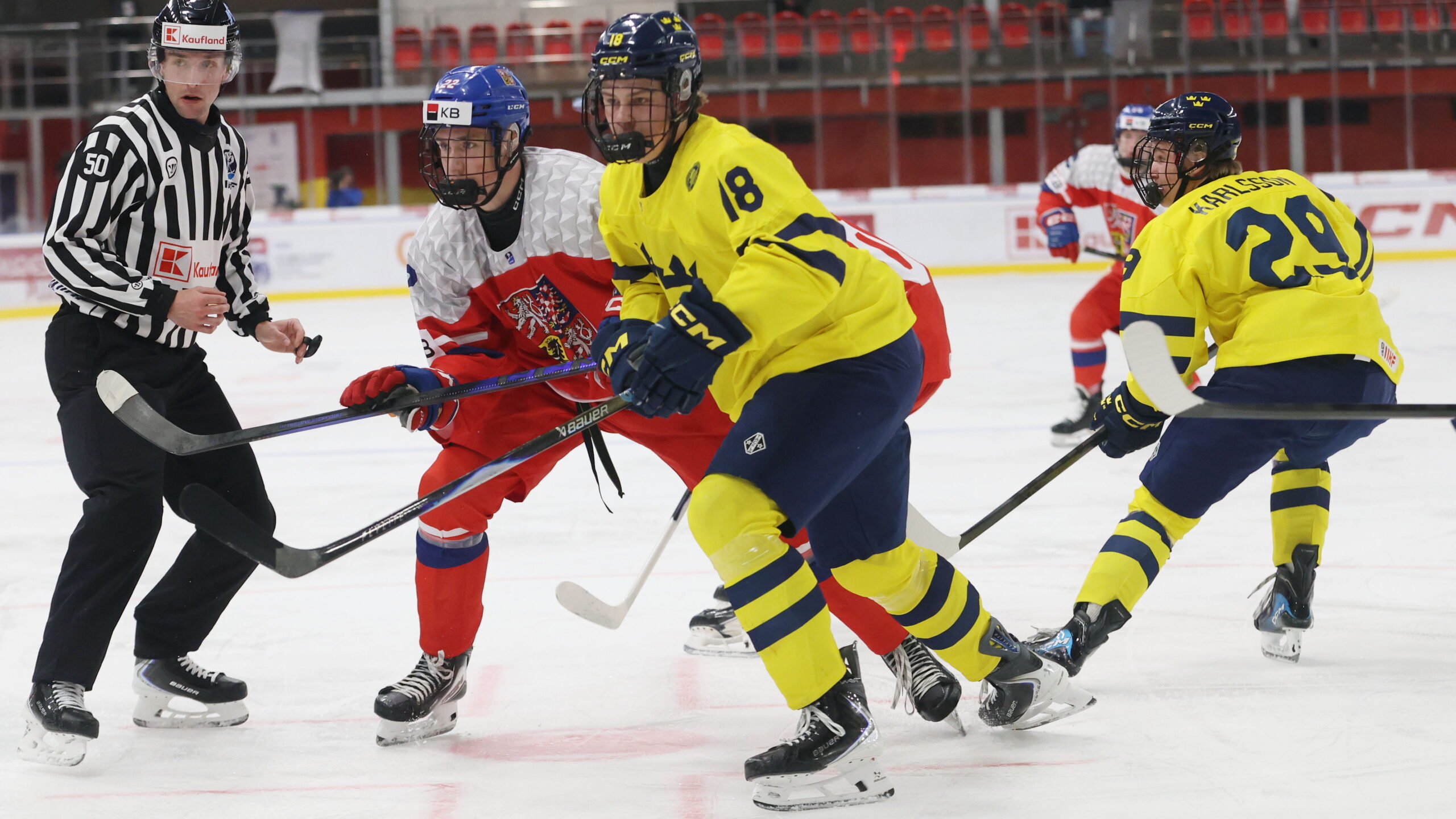 David Huk #22, Adam Andersson #18, Olle Karlsson #29, IIHF U18 World Championship 2026 SWE – CZE, Vladimír Dzurilla Arena, Bratislava, © Puckfans.at / Andreas Robanser