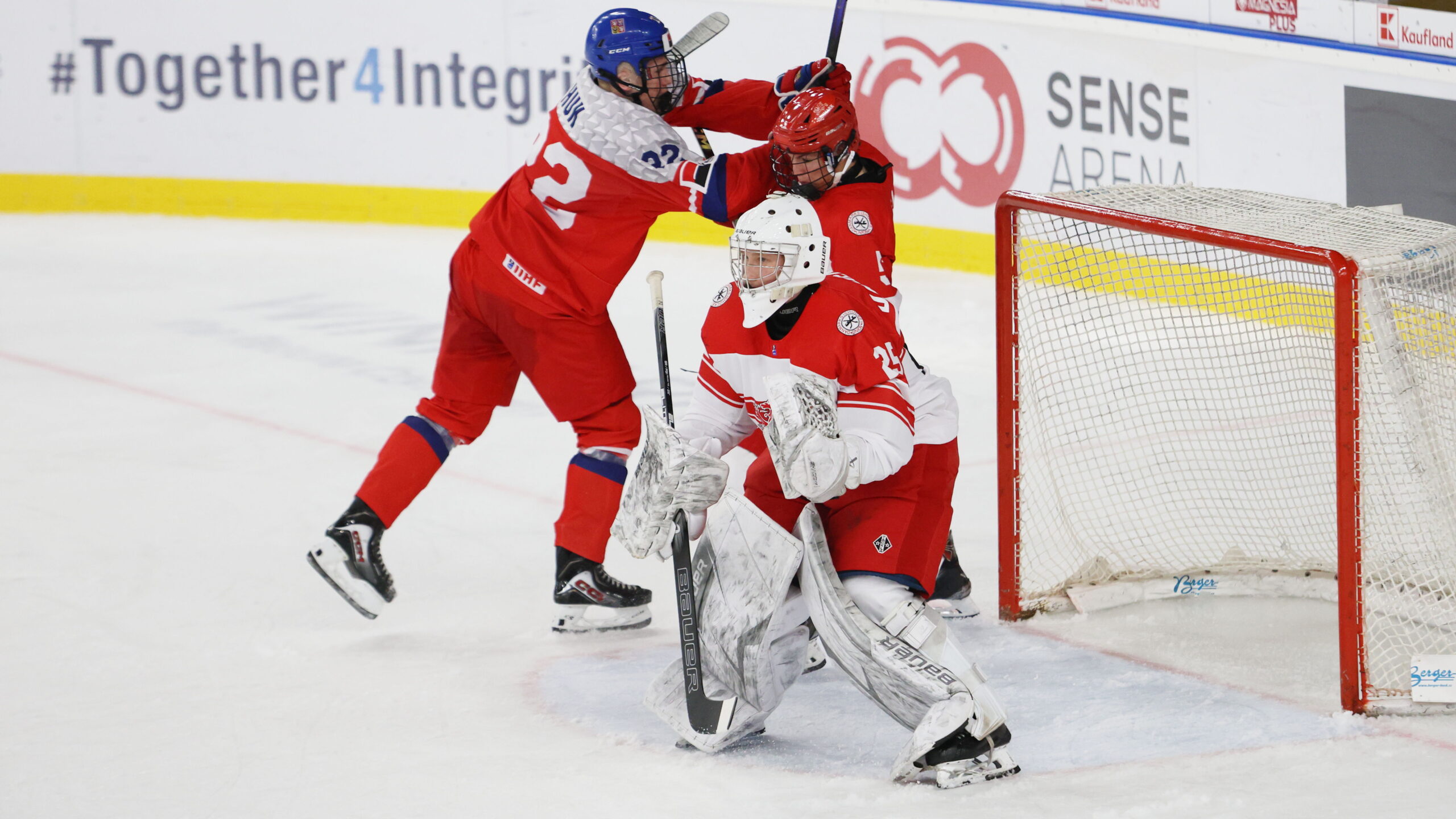 David Huk #22, Ulrik Norhøj Nielsen #5, Victor Damgaard #25, IIHF U18 World Championship 2026 CZE – DEN, Vladimír Dzurilla Arena, Bratislava, © Puckfans.at / Andreas Robanser