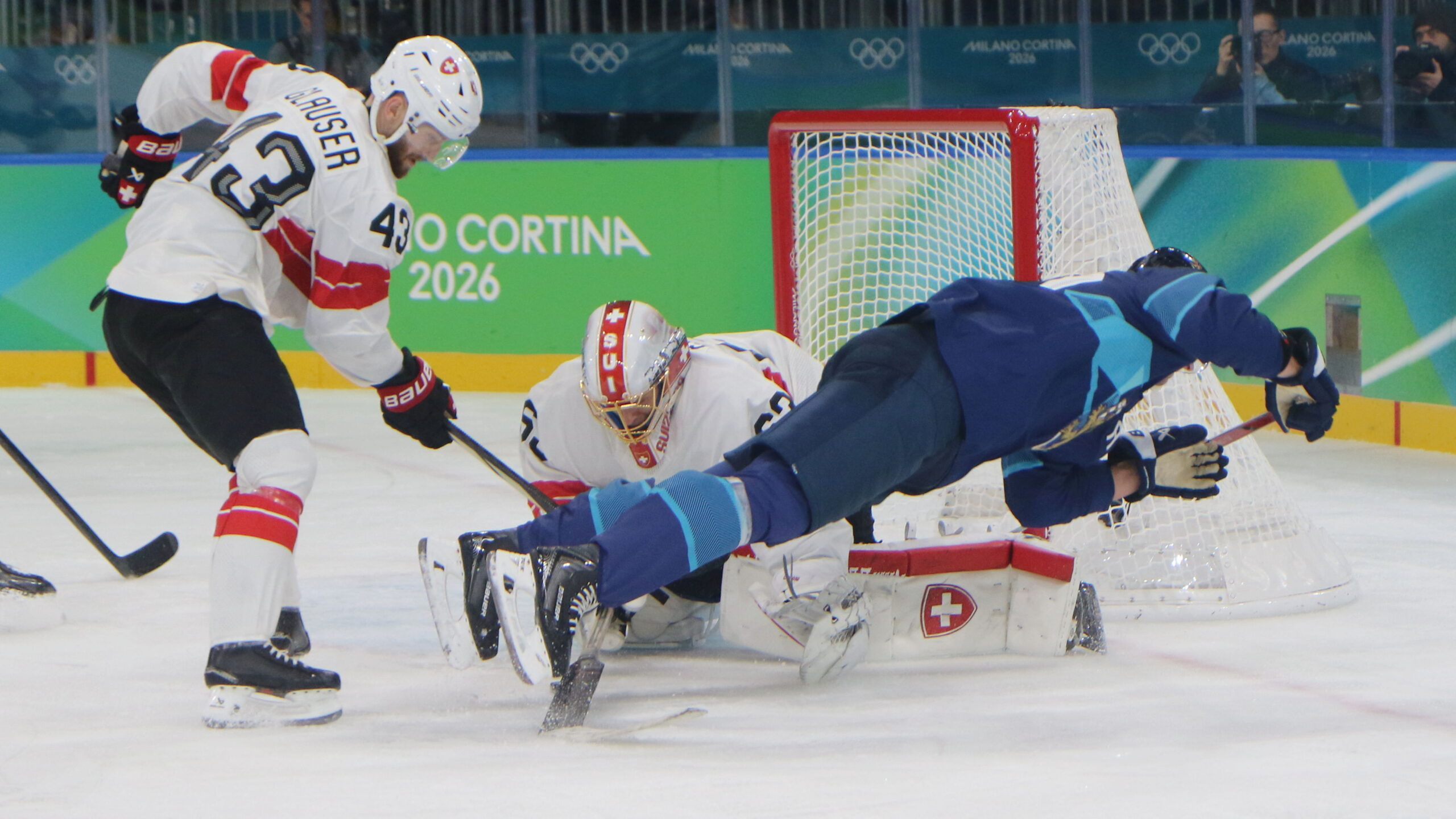 Andrea Glauser #43, Leonardo Genoni #63, Sebastian Aho #20, Olympic Games 2026 Mens QF FIN – SUI, Milano Rho Ice Park, © Puckfans.at / Andreas Robanser