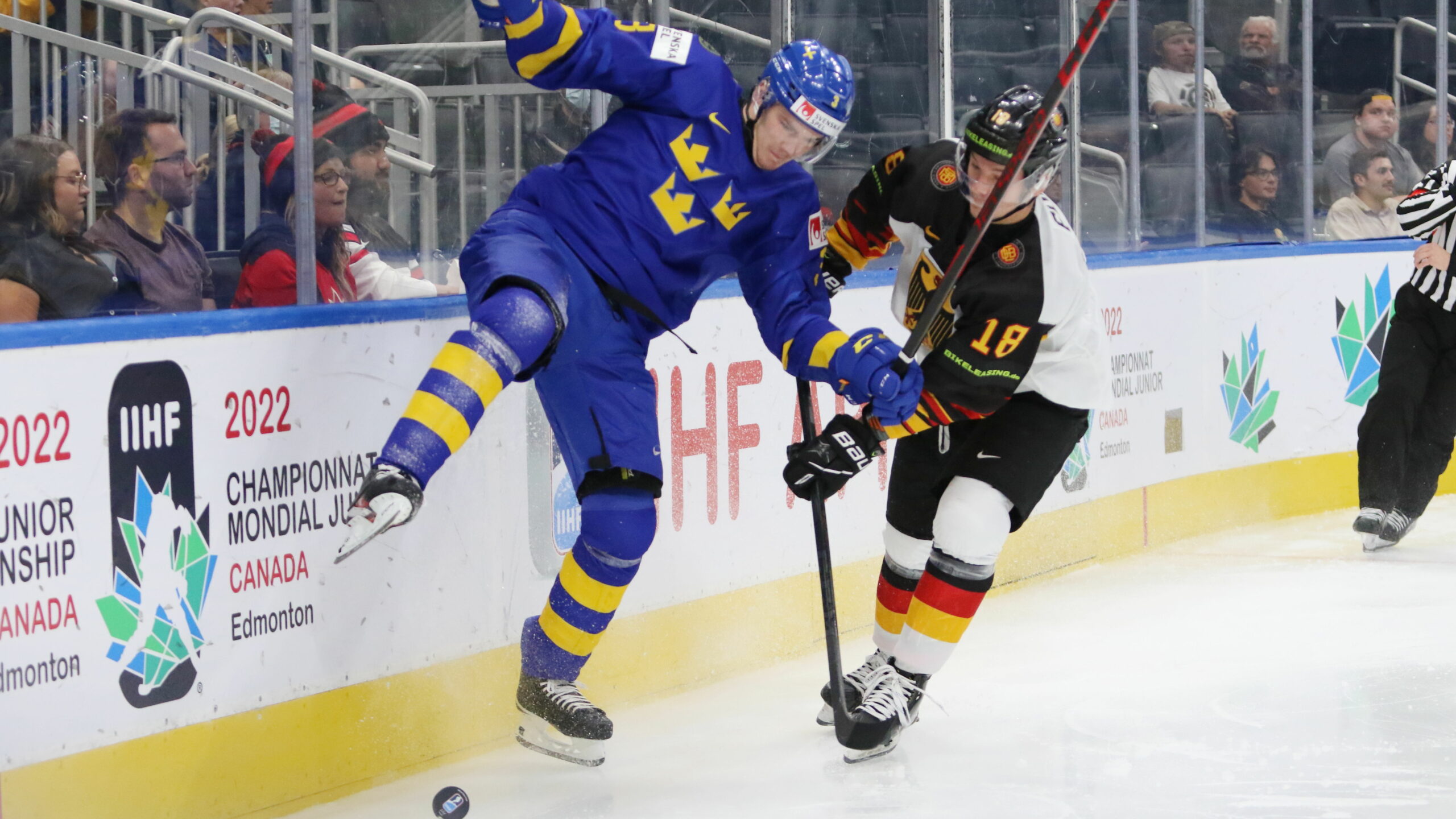 6T4A3170 16. August 2022 2560 × 1440 Deutschland im Viertelfinale gegen Finnland IIHF World Juniors 2022, SWE – GER Helge Grans #3, Josef Eham #18 Rogers Place, Edmonton, © Puckfans.at/Andreas Robanser