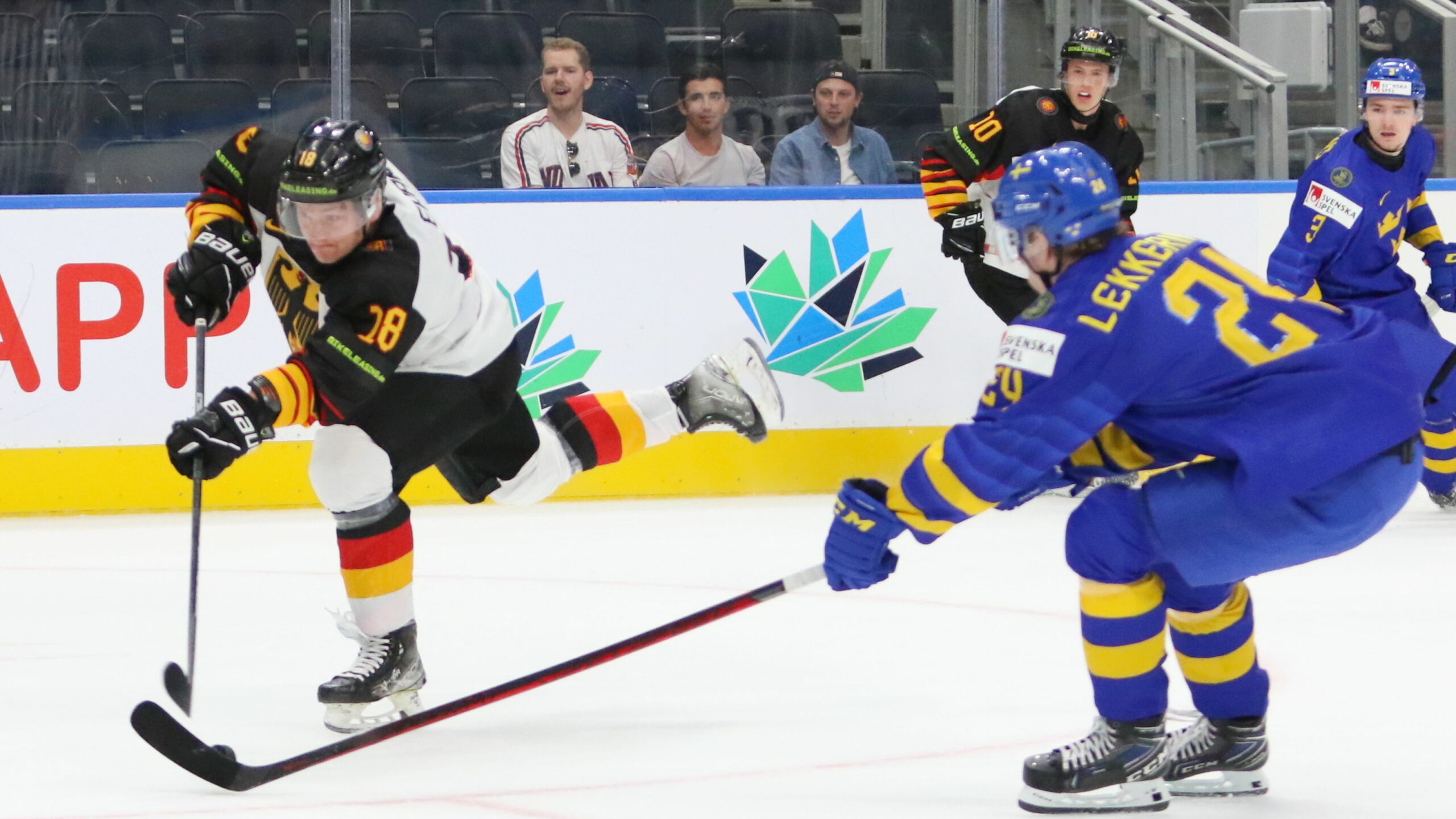 6T4A3246 16. August 2022 2560 × 1440 Deutschland im Viertelfinale gegen Finnland IIHF World Juniors 2022, SWE – GER Josef Eham #18, Jonathan Lekkerimäki #24 Rogers Place, Edmonton, © Puckfans.at/Andreas Robanser