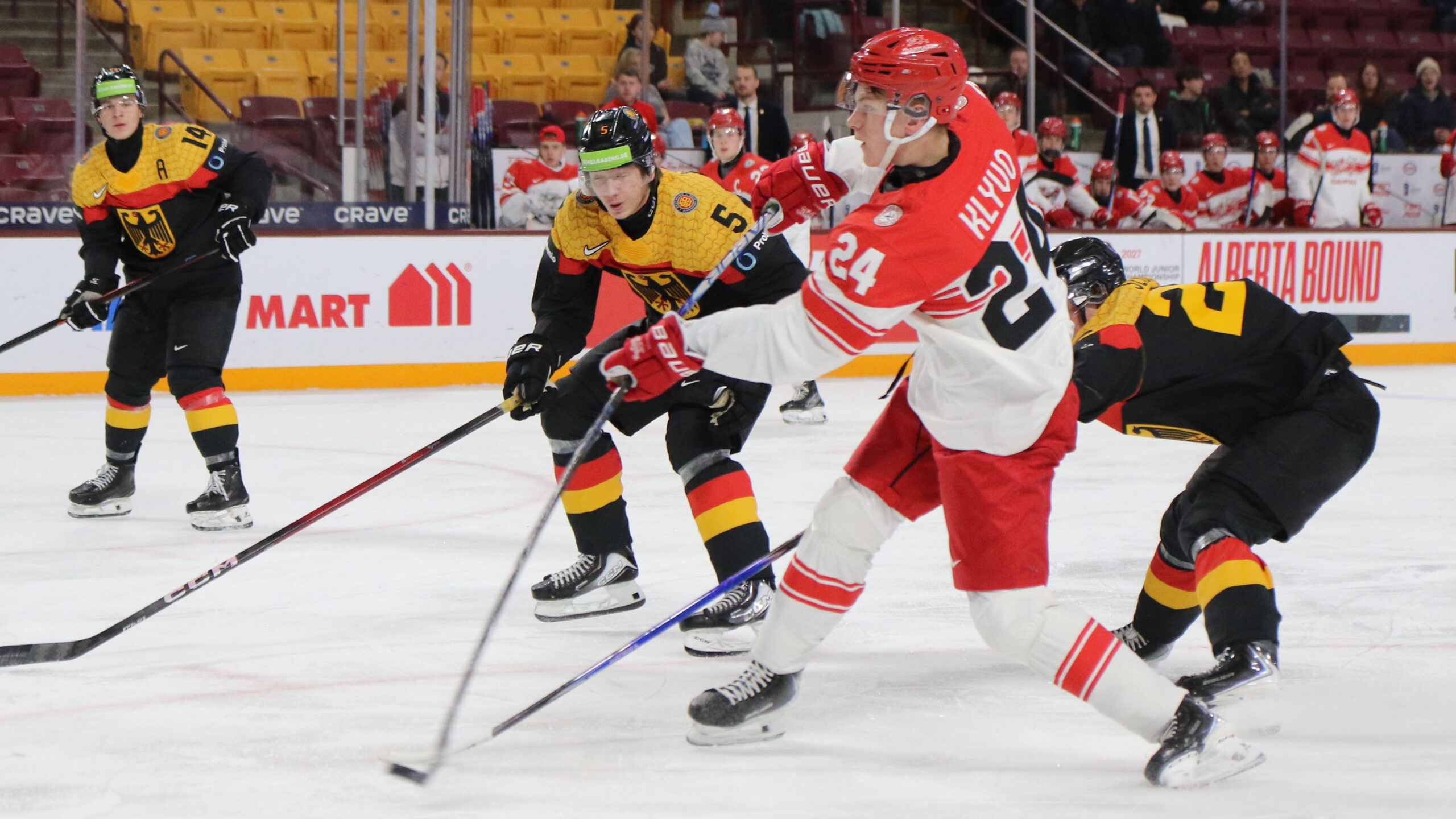 6T4A5505 2. Januar 2026 2560 × 1440 Deutschland sichert Klassenerhalt Nick Maul #14, Fabio Kose #5, Mads Kongsbak Klyvø #24, World Juniors 2026 Relegation GER – DEN, 3M Arena at Mariucci, Minneapolis © Puckfans.at / Andreas Robanser