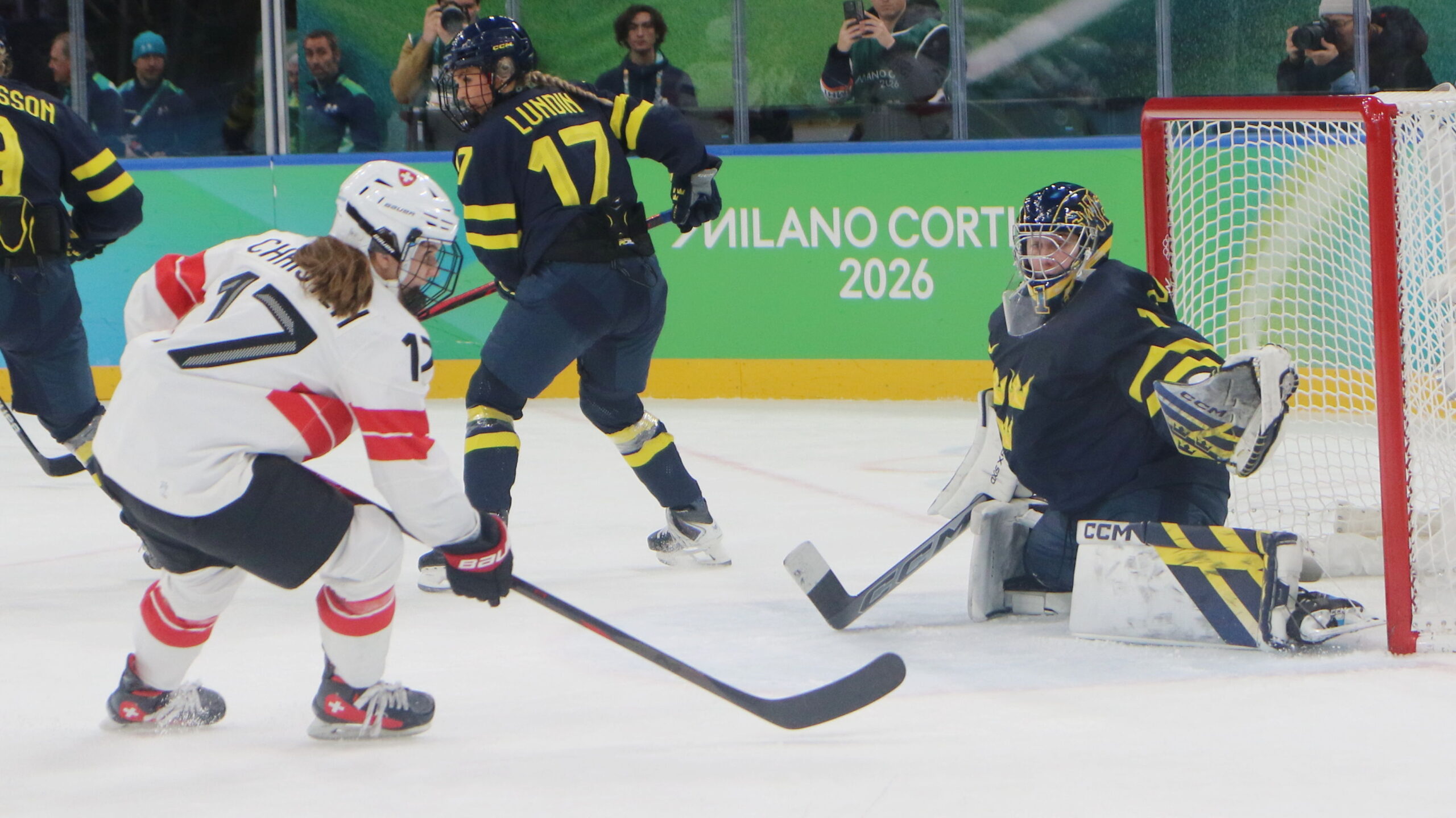 Lara Christen #17, Sofie Lundin #17, Ebba Svensson Träff #1, Olympic Games 2026 Womens Bronze Medal Game SUI – SWE, Milano Santa Giulia Arena, © Puckfans.at / Andreas Robanser