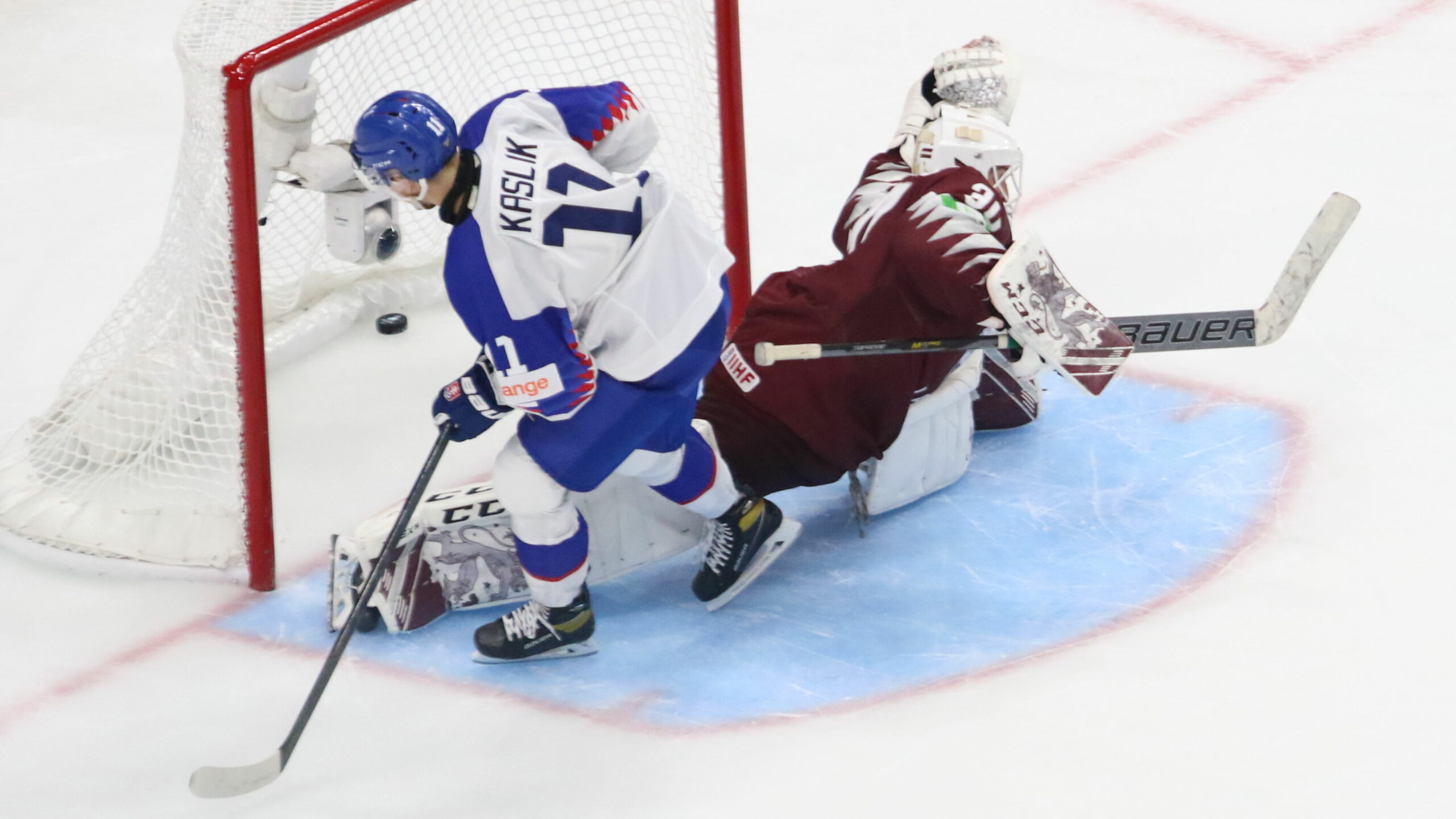 6T4A7122 13. August 2022 2560 × 1440 Die Slowakei feiert wichtigen Shootout Sieg IIHF World Juniors 2022, SVK – LAT Matej Kaslik #11, Bruno Bruveris #30 Rogers Place, Edmonton, © Puckfans.at/Andreas Robanser
