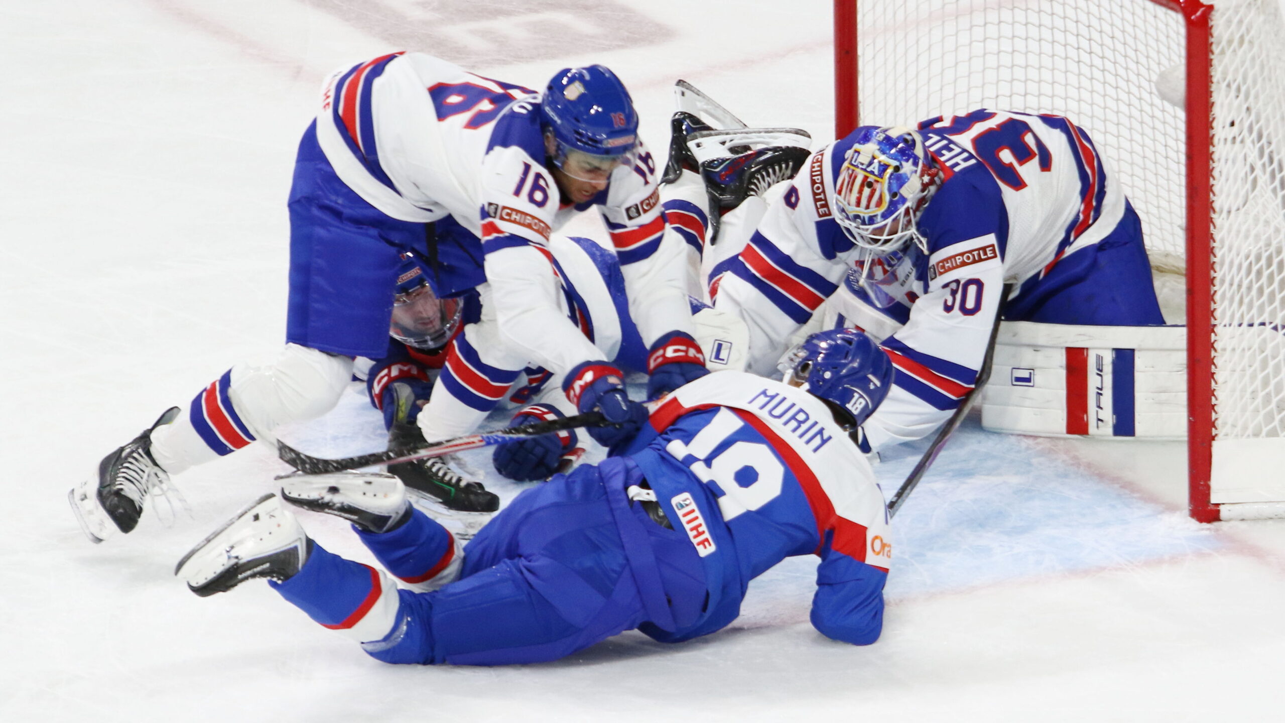 EJ Emery #16, Samuel Murin #18, Caleb Heil #30, World Juniors 2026 SVK – USA, Grand Casino Arena, Saint Paul © Puckfans.at / Andreas Robanser